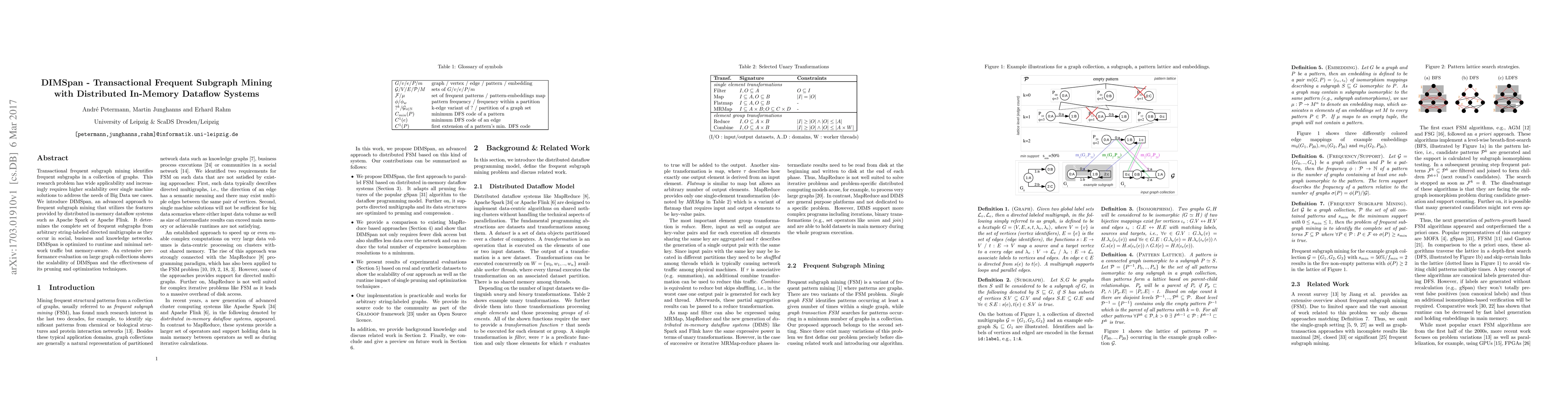 DIMSpan is a scalable approach for transactional frequent subgraph mining using distributed in-memory dataflow systems, achieving optimal runtime and minimal network traffic while handling large graph collections effectively. Its performance evaluation demonstrates significant scalability and the efficacy of its optimization techniques.