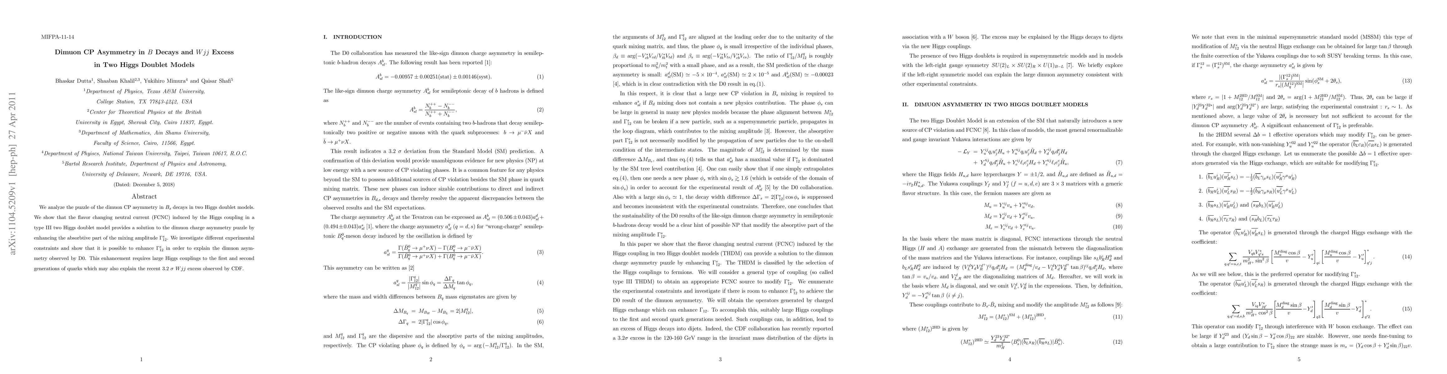 This paper explores the dimuon CP asymmetry in B_s decays within two Higgs doublet models, suggesting that a type III model can resolve the observed asymmetry through enhanced flavor-changing neutral current interactions. It also links this enhancement to a potential explanation for the recent 3.2 σ Wjj excess observed by CDF.