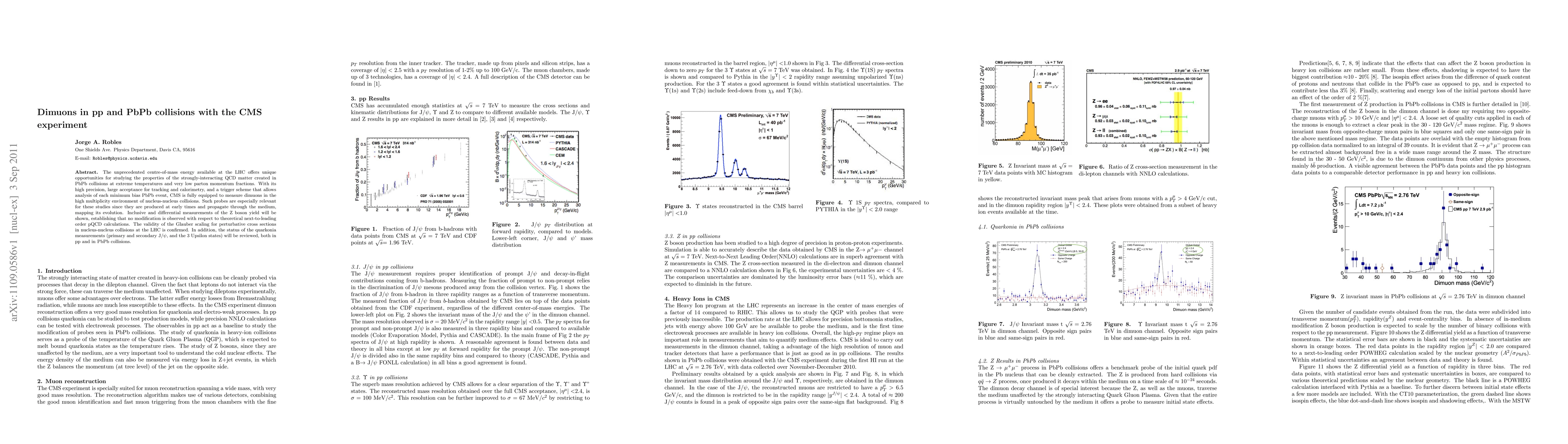 The unprecedented centre-of-mass energy available at the LHC offers unique opportunities for studying the properties of the strongly-interacting QCD matter created in PbPb collisions at extreme temperatures and very low parton momentum fractions. With its high precision, large acceptance for tracking and calorimetry, and a trigger scheme that allows analysis of each minimum bias PbPb event, CMS is fully equipped to measure dimuons in the high multiplicity environment of nucleus-nucleus collisions. Such probes are especially relevant for these studies since they are produced at early times and propagate through the medium, mapping its evolution. Inclusive and differential measurements of the Z boson yield will be shown, establishing that no modification is observed with respect to theoretical next-to-leading order pQCD calculations. The validity of the Glauber scaling for perturbative cross sections in nucleus-nucleus collisions at the LHC is confirmed. In addition, the status of the quarkonia measurements (primary and secondary J/\psi, and the 3 Upsilon states) will be reviewed, both in pp and in PbPb collisions.