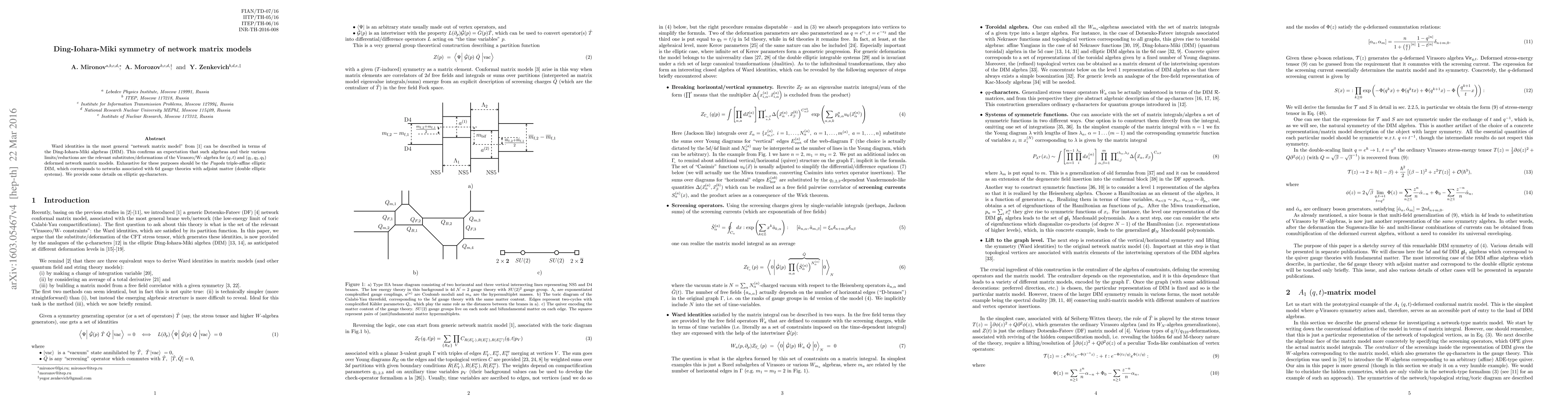Ward identities in the most general "network matrix model" can be described in terms of the Ding-Iohara-Miki algebras (DIM). This confirms an expectation that such algebras and their various limits/reductions are the relevant substitutes/deformations of the Virasoro/W-algebra for (q, t) and (q_1, q_2, q_3) deformed network matrix models. Exhaustive for these purposes should be the Pagoda triple-affine elliptic DIM, which corresponds to networks associated with 6d gauge theories with adjoint matter (double elliptic systems). We provide some details on elliptic qq-characters.