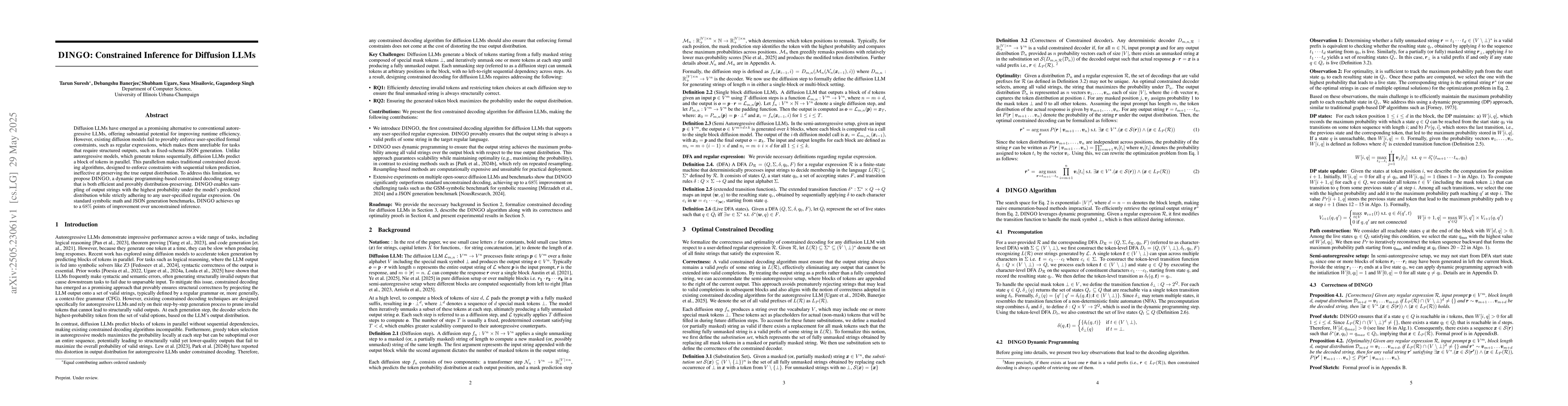 Researchers propose DINGO, a constrained decoding strategy for diffusion LLMs, which improves runtime efficiency and ensures provably distribution-preserving sampling while satisfying user-specified regular expressions.