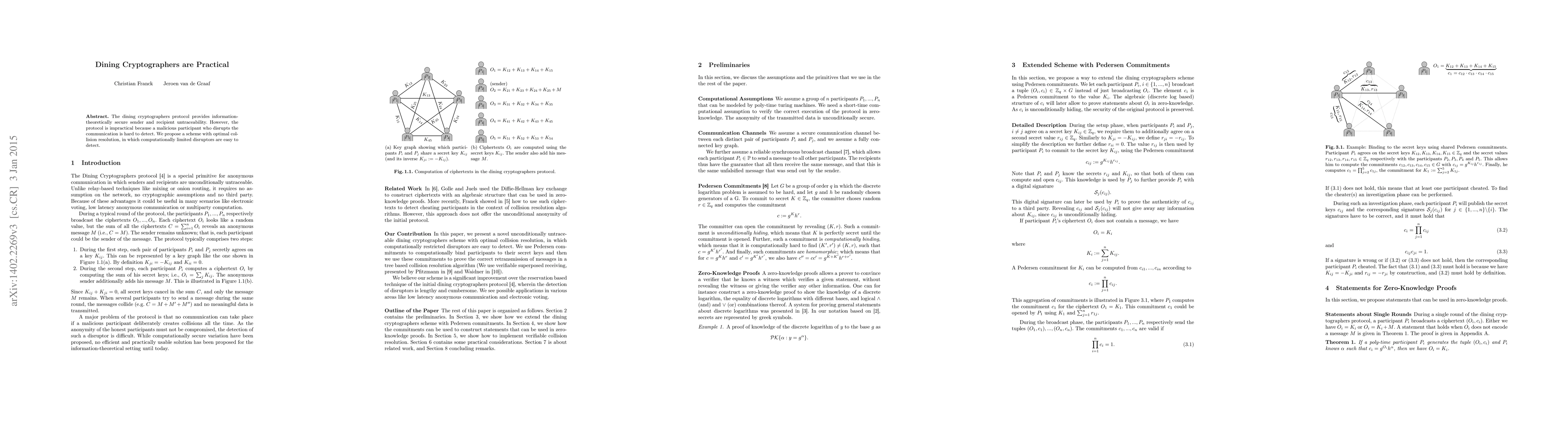 The dining cryptographers protocol provides information-theoretically secure sender and recipient untraceability. However, the protocol is considered to be impractical because a malicious participant may disrupt the communication. We propose an implementation which provides information-theoretical security for senders and recipients, and in which a disruptor with limited computational capabilities can easily be detected.