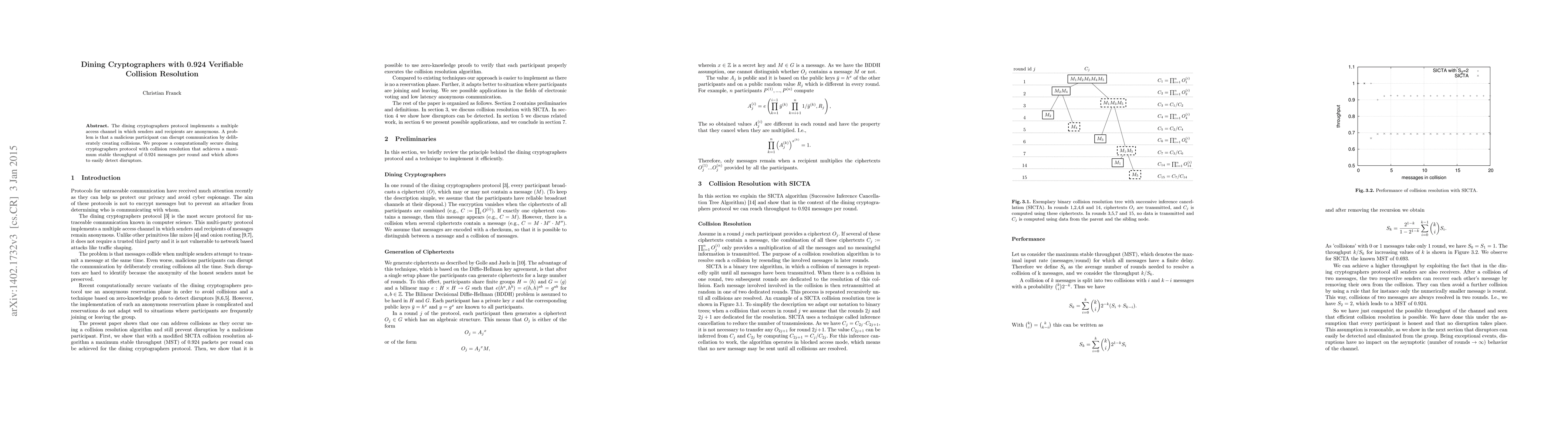 The paper presents a secure dining cryptographers protocol that maintains anonymous communication while resolving collisions with a maximum throughput of 0.924 messages per round, and it also enables the detection of malicious participants disrupting the communication.