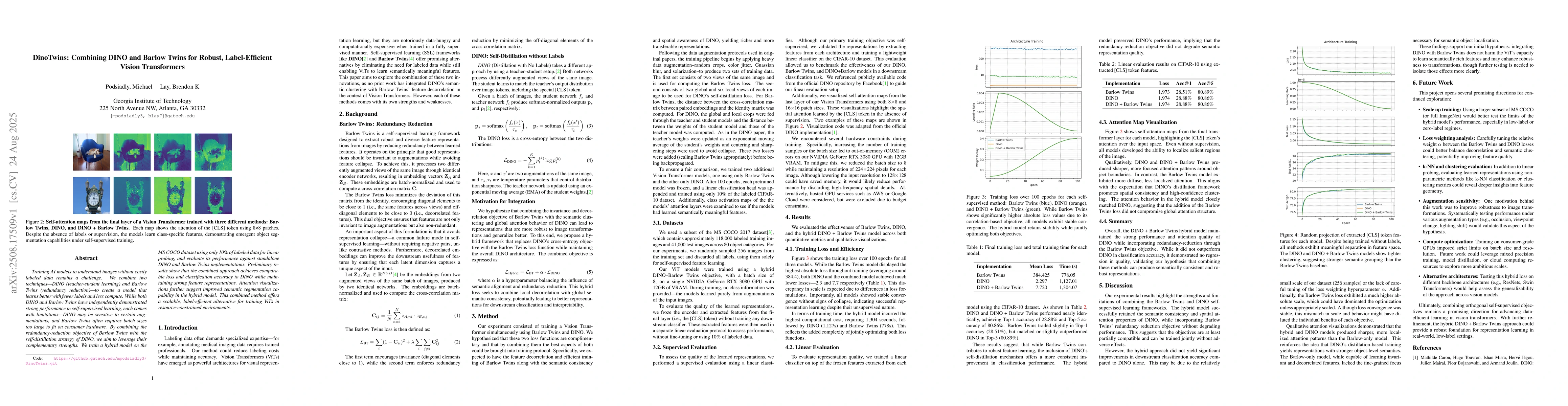 Training AI models to understand images without costly labeled data remains a challenge. We combine two techniques--DINO (teacher-student learning) and Barlow Twins (redundancy reduction)--to create a model that learns better with fewer labels and less compute. While both DINO and Barlow Twins have independently demonstrated strong performance in self-supervised learning, each comes with limitations--DINO may be sensitive to certain augmentations, and Barlow Twins often requires batch sizes too large to fit on consumer hardware. By combining the redundancy-reduction objective of Barlow Twins with the self-distillation strategy of DINO, we aim to leverage their complementary strengths. We train a hybrid model on the MS COCO dataset using only 10\% of labeled data for linear probing, and evaluate its performance against standalone DINO and Barlow Twins implementations. Preliminary results show that the combined approach achieves comparable loss and classification accuracy to DINO while maintaining strong feature representations. Attention visualizations further suggest improved semantic segmentation capability in the hybrid model. This combined method offers a scalable, label-efficient alternative for training ViTs in resource-constrained environments.