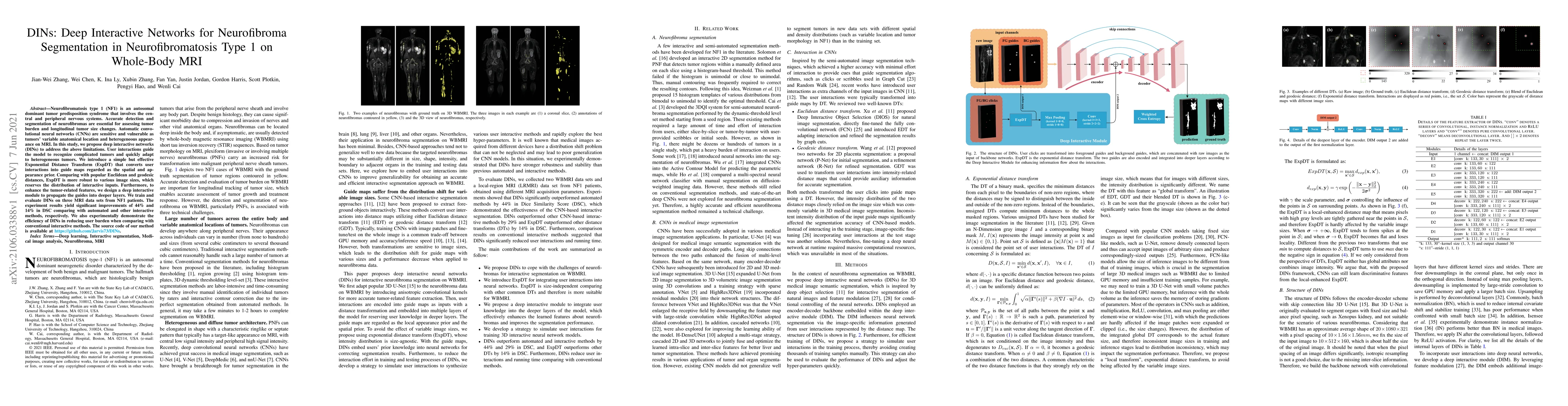 This paper proposes deep interactive networks (DINs) to improve the segmentation of neurofibromas in Neurofibromatosis type 1 (NF1) using whole-body MRI. The method integrates user interactions via an Exponential Distance Transform (ExpDT) to guide the model, enhancing its adaptability to tumor heterogeneity and improving segmentation accuracy.