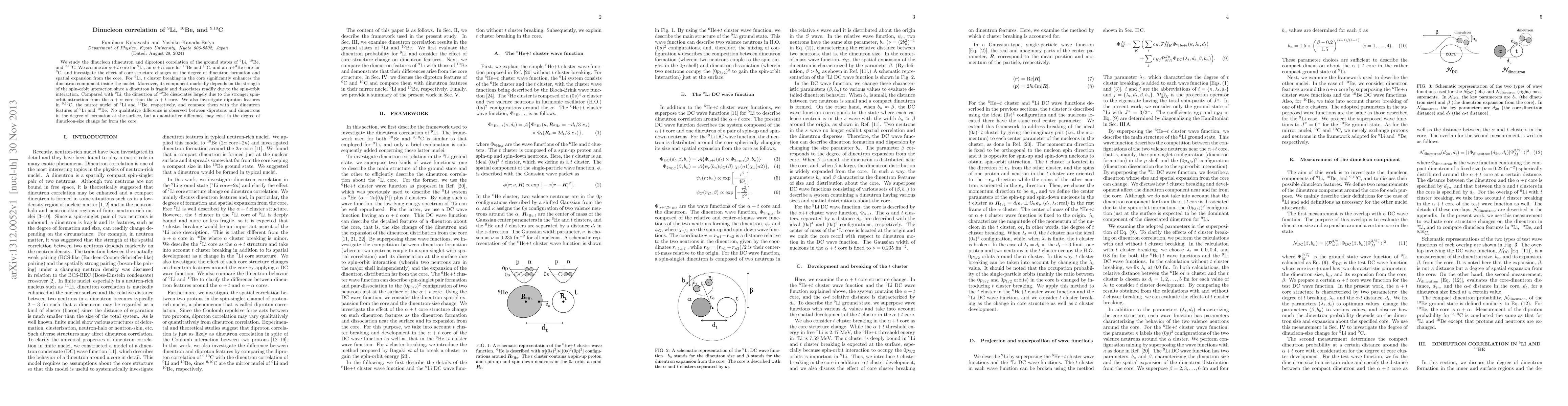 This research investigates dinucleon correlations in $^9$Li, $^{10}$Be, and $^{9,10}$C, revealing that $^9$Li's dineutron component is significantly enhanced by $t$ cluster breaking, while $^{10}$Be's dineutron dissociates due to stronger spin-orbit attraction. Diprotons in $^{9,10}$C show no qualitative difference in dinucleon formation compared to dineutrons in $^9$Li and $^{10}$Be, though quantitative differences in dinucleon size may exist.