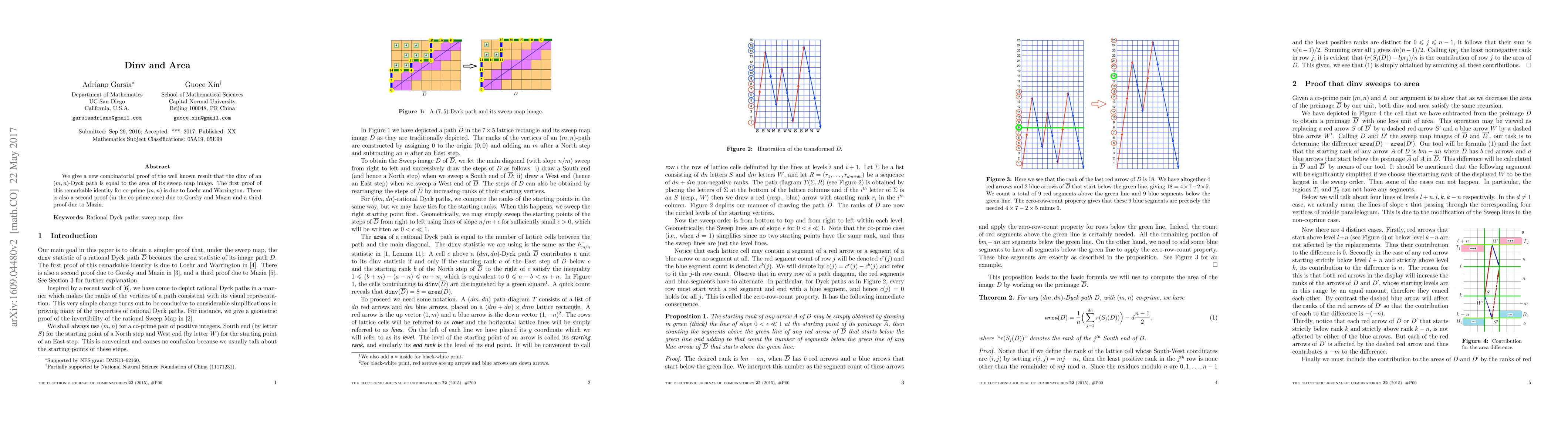 We give a new combinatorial proof of the well known result that the dinv of an $(m,n)$-Dyck path is equal to the area of its sweep map image. The first proof of this remarkable identity for co-prime $(m,n)$ is due to Loehr and Warrington. There is also a second proof (in the co-prime case) due to Gorsky and Mazin and a third proof due to Mazin.