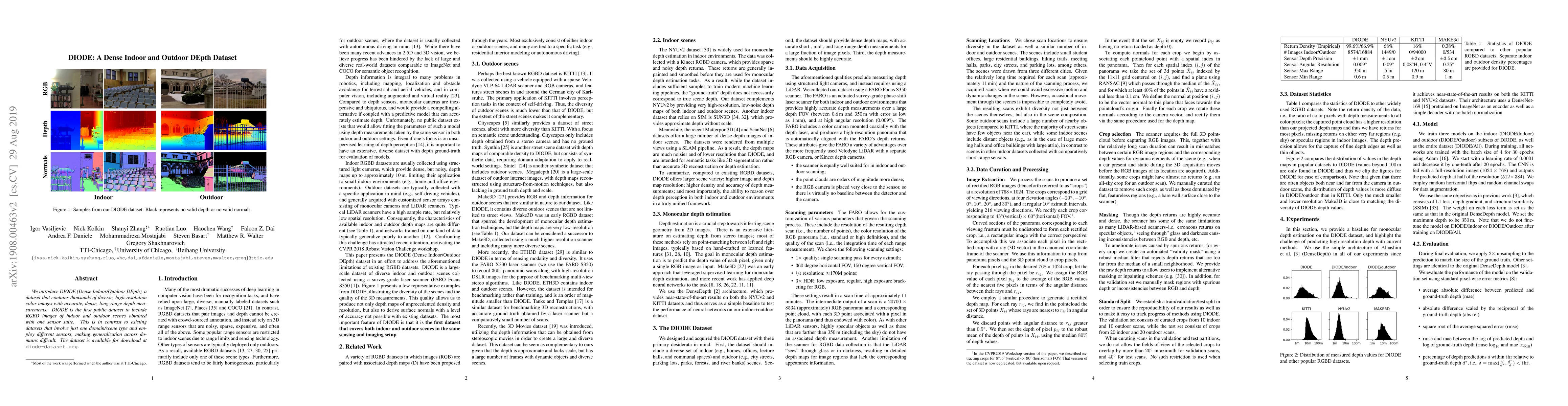 DIODE is a novel dataset featuring high-resolution RGBD images with dense depth measurements for both indoor and outdoor scenes, obtained using a single sensor suite. It aims to facilitate research in depth estimation by providing a comprehensive resource for both environments.