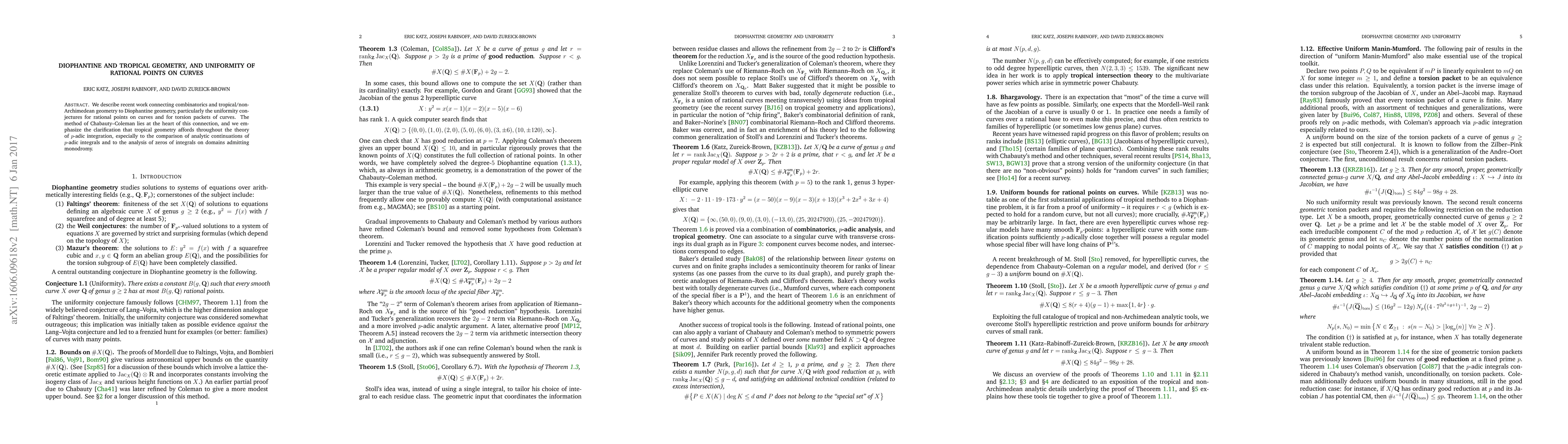 We describe recent work connecting combinatorics and tropical/non-Archimedean geometry to Diophantine geometry, particularly the uniformity conjectures for rational points on curves and for torsion packets of curves. The method of Chabauty--Coleman lies at the heart of this connection, and we emphasize the clarification that tropical geometry affords throughout the theory of $p$-adic integration, especially to the comparison of analytic continuations of $p$-adic integrals and to the analysis of zeros of integrals on domains admitting monodromy.