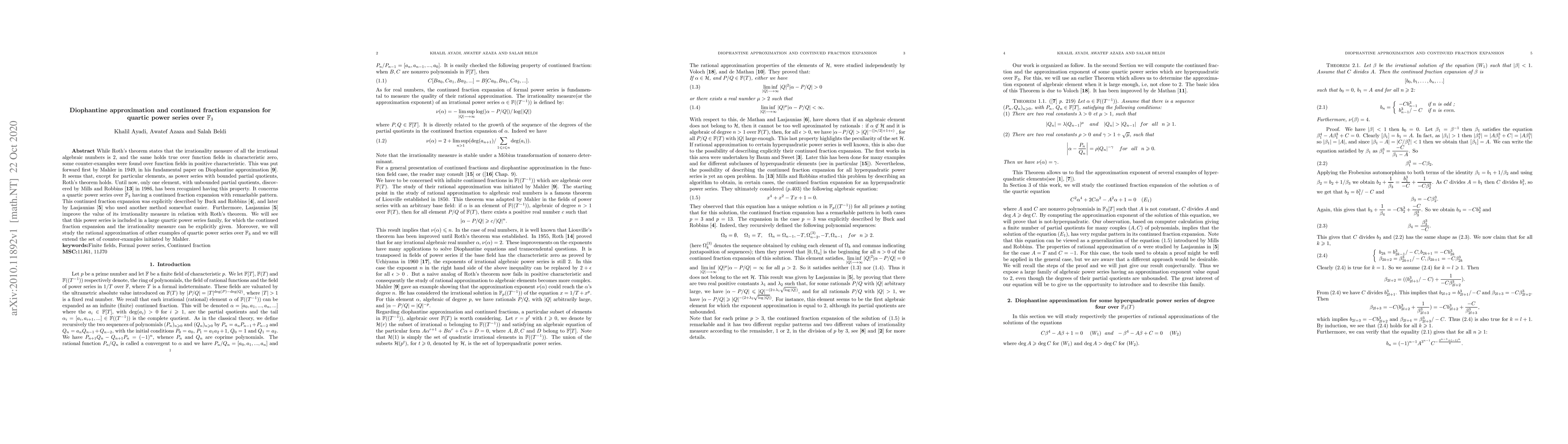While Roth's theorem states that the irrationality measure of all the irrational algebraic numbers is 2, and the same holds true over function fields in characteristic zero, some counter-examples were found over function fields in positive characteristic. This was put forward first by Mahler in 1949, in his fundamental paper on Diophantine approximation \cite{M}. It seems that, except for particular elements, as power series with bounded partial quotients, Roth's theorem holds. Until now, only one element, with unbounded partial quotients, discovered by Mills and Robbins \cite{MR} in 1986, has been recognized having this property. It concerns a quartic power series over $\mathbb{F}_{3}$ having a continued fraction expansion with remarkable pattern. This continued fraction expansion was explicitly described by Buck and Robbins \cite{BR}, and later by Lasjaunias \cite{LA2} who used another method somewhat easier. Furthermore, Lasjaunias \cite{LA2} improve the value of its irrationality measure in relation with Roth's theorem. We will see that this power series is included in a large quartic power series family, for which the continued fraction expansion and the irrationality measure can be explicitly given. Moreover, we will study the rational approximation of other examples of quartic power series over $\mathbb{F}_{3}$ and we will extend the set of counter-examples initiated by Mahler.