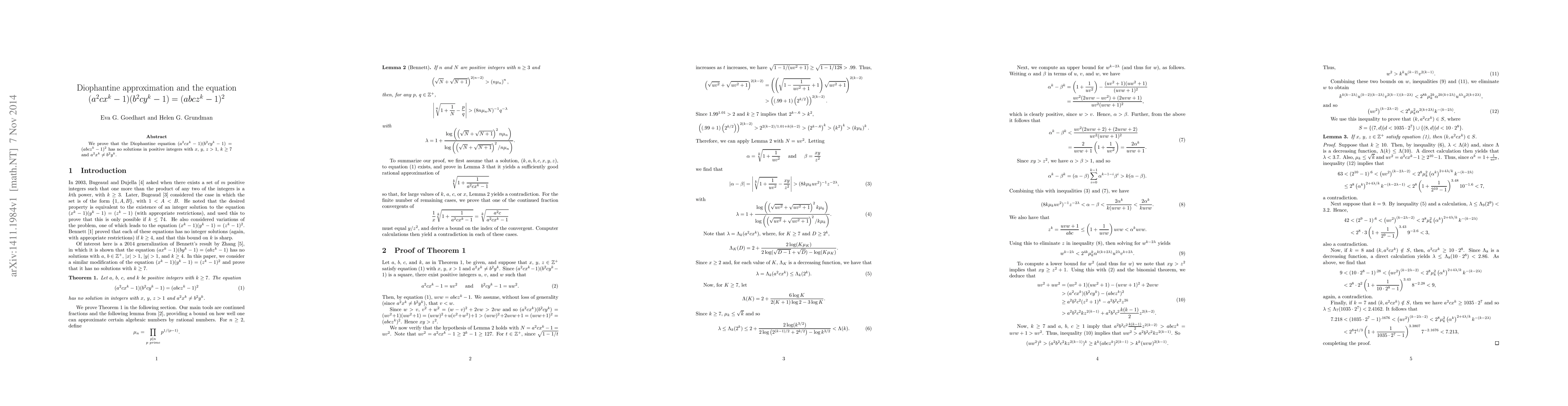 We prove that the Diophantine equation (a^2 c x^k - 1)(b^2 c y^k - 1) = (abc z^k - 1)^2 has no solutions in positive integers with x, y, z > 1, k \geq 7 and a^2x^k \neq b^2y^k.