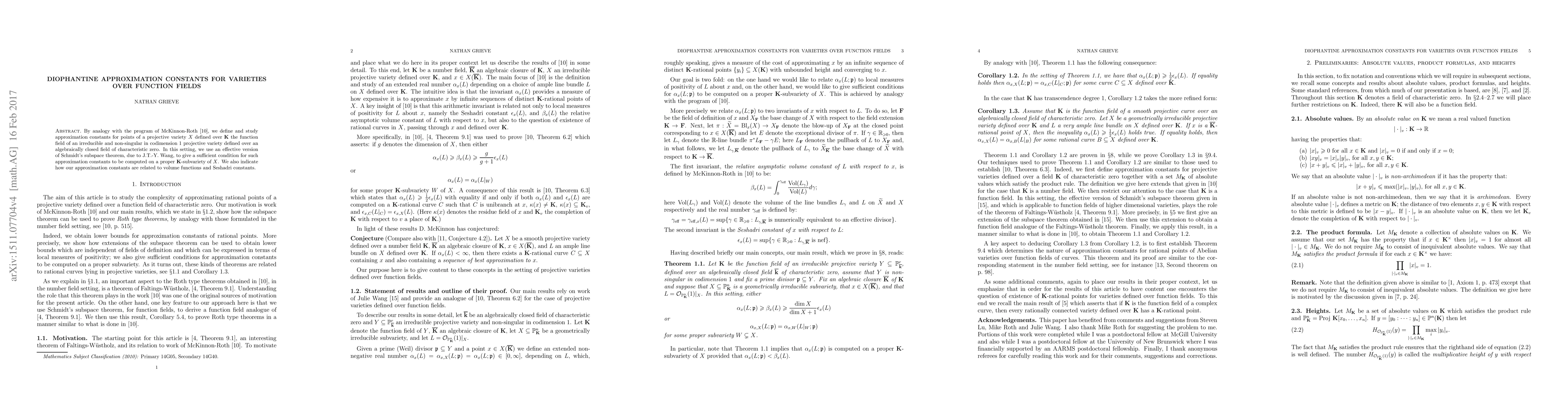 This research defines approximation constants for points on a projective variety over a function field, using Wang's version of Schmidt's subspace theorem. It also links these constants to volume functions and Seshadri constants, providing insights into the geometry of function fields.