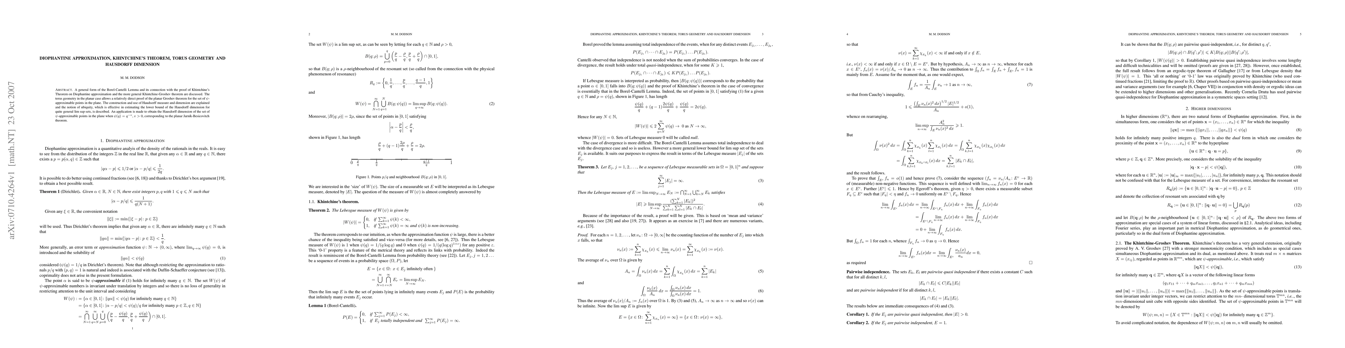 The paper discusses a general form of the Borel-Cantelli Lemma and its connection with Khintchine's Theorem on Diophantine approximation, utilizing torus geometry and Hausdorff dimension. It establishes pairwise quasi-independence of sets B(q; ρ) and applies an ergodic-type theorem by Gallagher to prove the Khintchine-Groshev theorem.