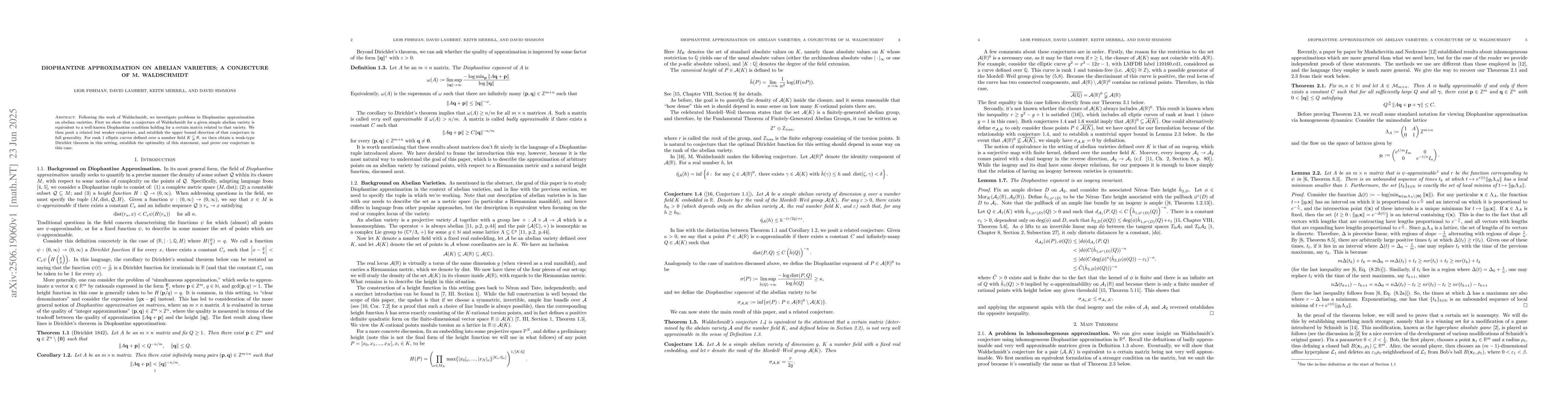 Following the work of Waldschmidt, we investigate problems in Diophantine approximation on abelian varieties. First we show that a conjecture of Waldschmidt for a given simple abelian variety is equivalent to a well-known Diophantine condition holding for a certain matrix related to that variety. We then posit a related but weaker conjecture, and establish the upper bound direction of that conjecture in full generality. For rank 1 elliptic curves defined over a number field $K \subset \mathbb{R}$, we then obtain a weak-type Dirichlet theorem in this setting, establish the optimality of this statement, and prove our conjecture in this case.