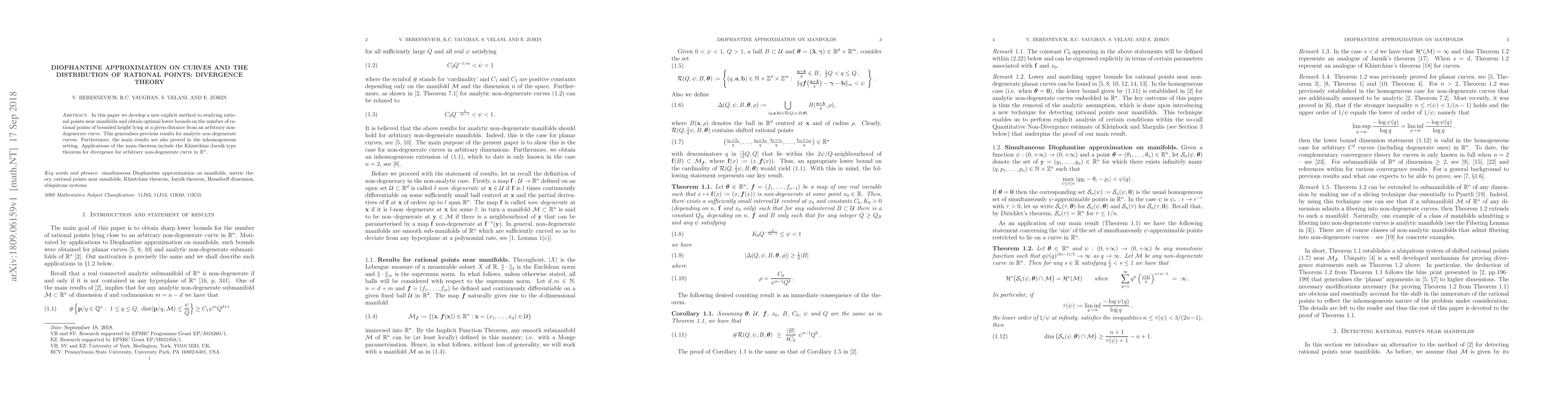 This paper introduces a novel method for studying rational points near manifolds, providing optimal lower bounds on the number of such points near non-degenerate curves. It generalizes previous results and extends the findings to inhomogeneous settings, with applications including a Khintchine-Jarník type divergence theorem for arbitrary non-degenerate curves in $\mathbb{R}^n$.