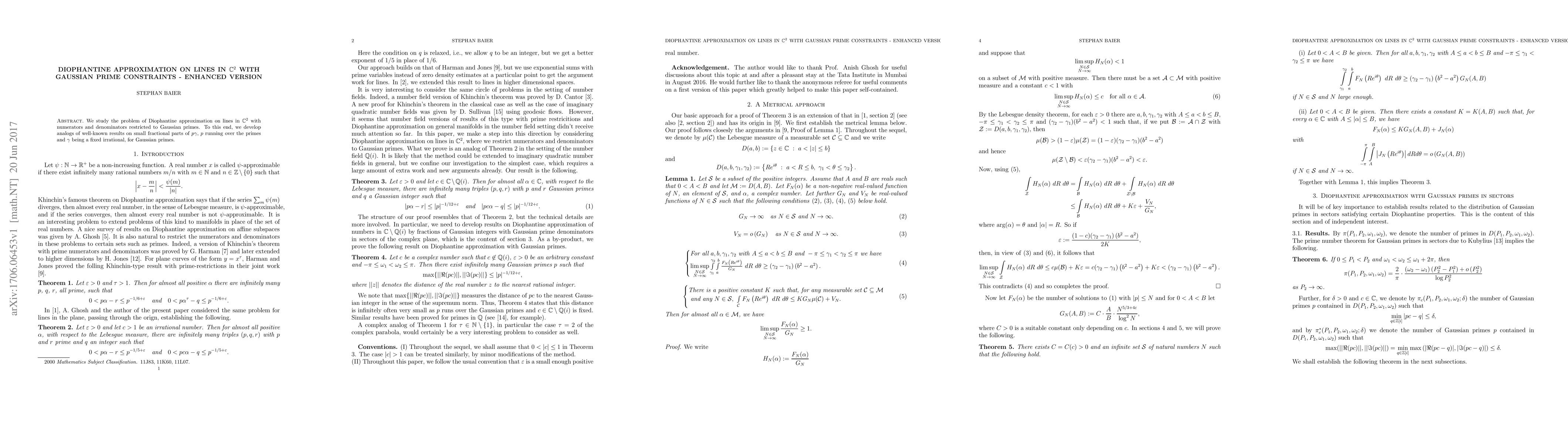 This paper explores Diophantine approximation on lines in $\mathbb{C}^2$ where the numerators and denominators are constrained to Gaussian primes, developing analogous results for small fractional parts of $p\gamma$ for Gaussian primes $p$.