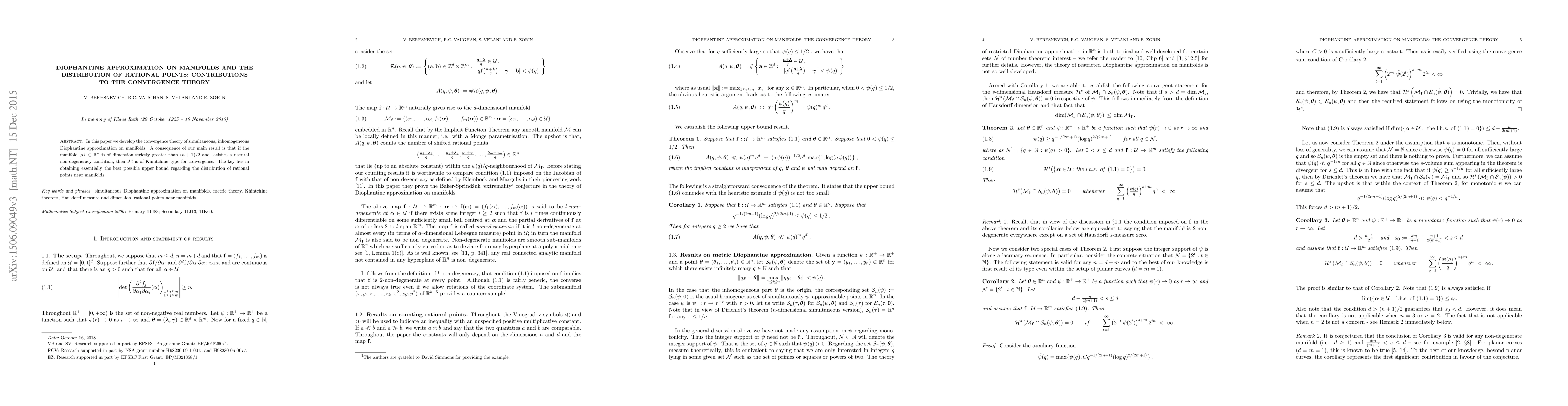 This paper develops a convergence theory for simultaneous, inhomogeneous Diophantine approximation on manifolds, proving that certain high-dimensional manifolds are of Khintchine type for convergence, contingent on a non-degeneracy condition. The study focuses on achieving the best possible upper bound for the distribution of rational points near these manifolds.