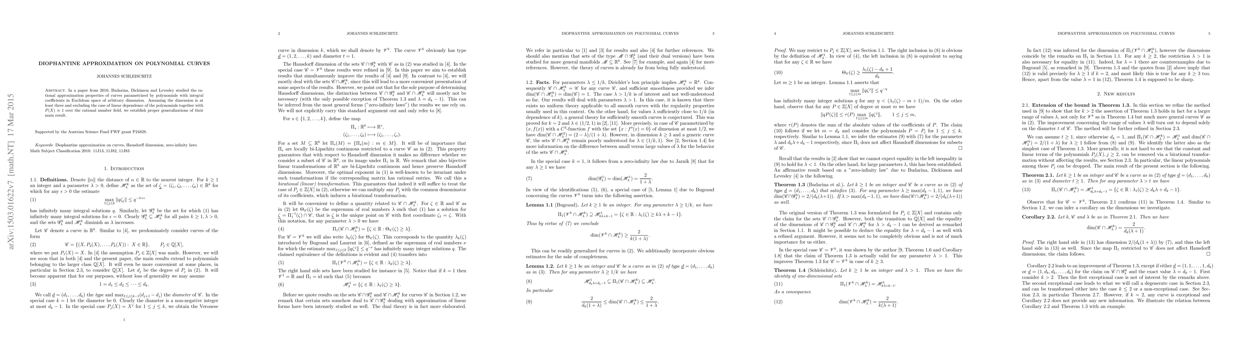 This paper generalizes a 2010 study on rational approximation properties of curves parametrized by polynomials with integral coefficients in Euclidean space of arbitrary dimension. It establishes proper results under specific conditions, providing new insights into Diophantine approximations.