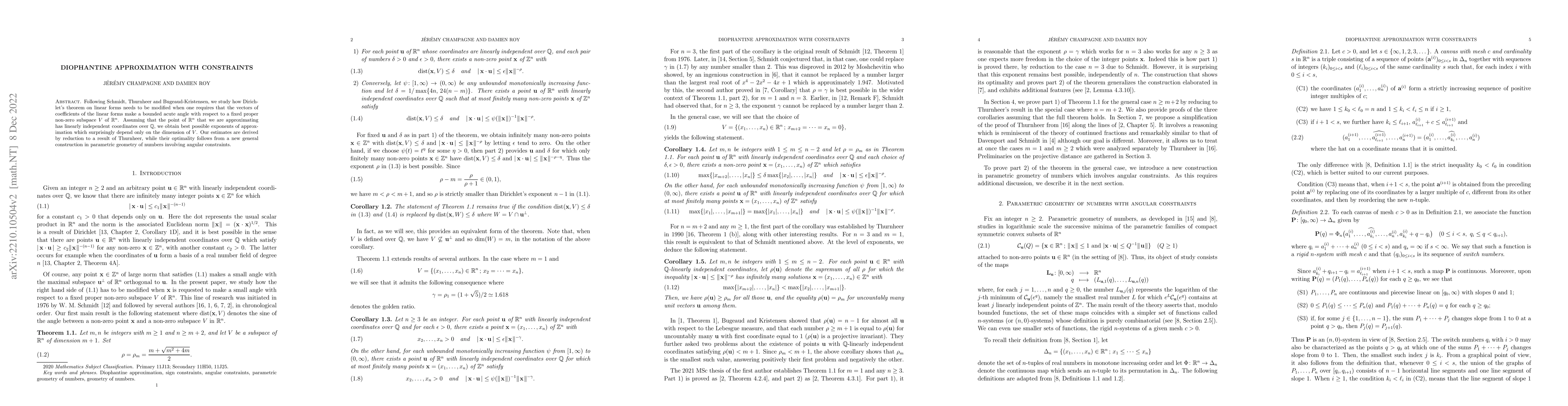 This paper modifies Dirichlet's theorem on linear forms to account for vectors making a bounded acute angle with a fixed subspace $V$ in $\mathbb{R}^n$. The authors derive optimal approximation exponents depending solely on the dimension of $V$, using a reduction to Thurnheer's result and a novel construction in parametric geometry of numbers.