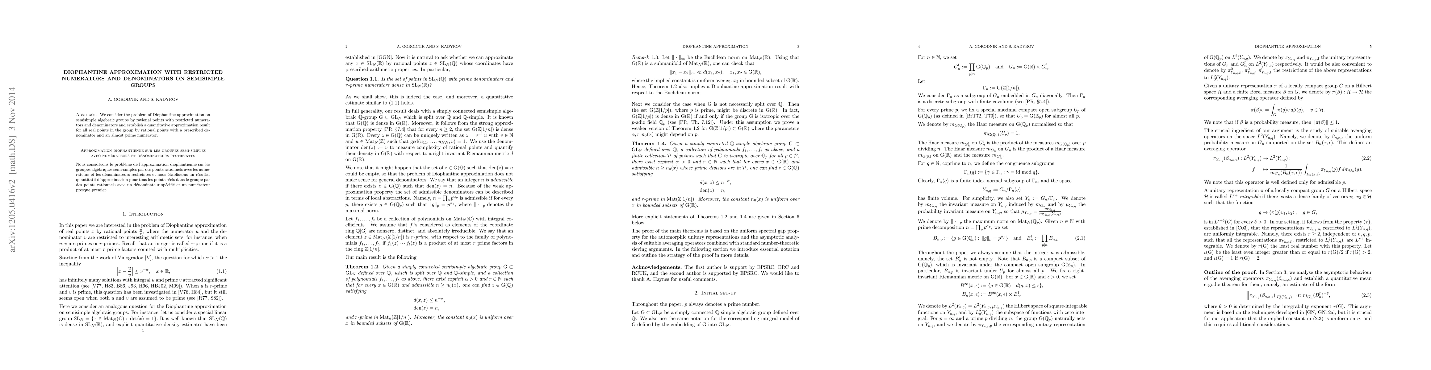 Summary: This paper addresses Diophantine approximation on semisimple algebraic groups using rational points with restricted, almost prime numerators and arbitrary denominators, establishing a quantitative approximation result for real points.