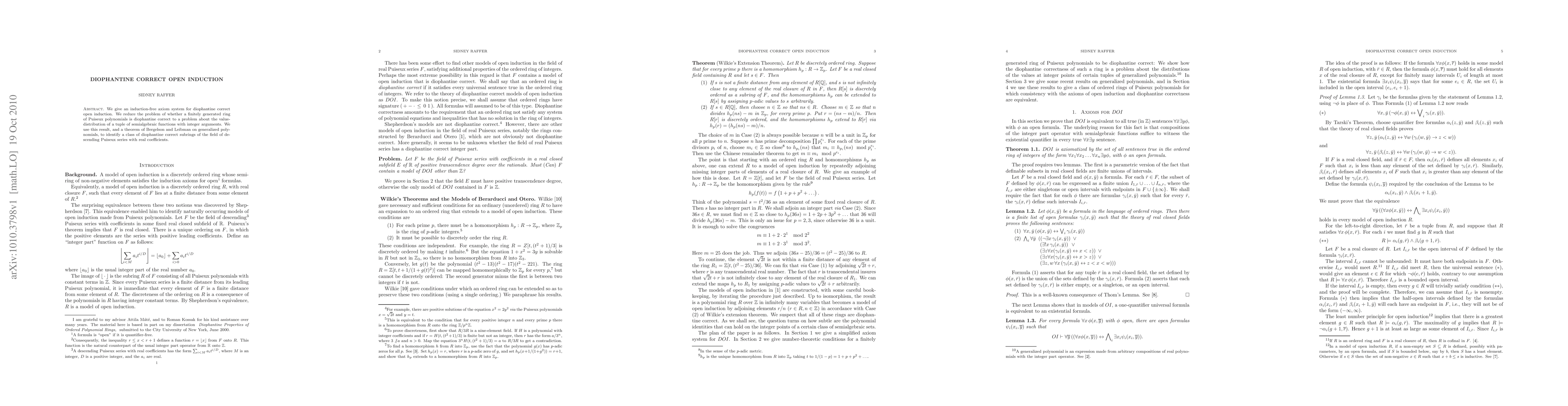 This paper presents an induction-free axiom system for diophantine correct open induction and links the correctness of finitely generated rings of Puiseux polynomials to the value-distribution of semialgebraic functions. It identifies a class of diophantine correct subrings within the field of descending Puiseux series using Bergelson and Leibman's theorem on generalized polynomials.