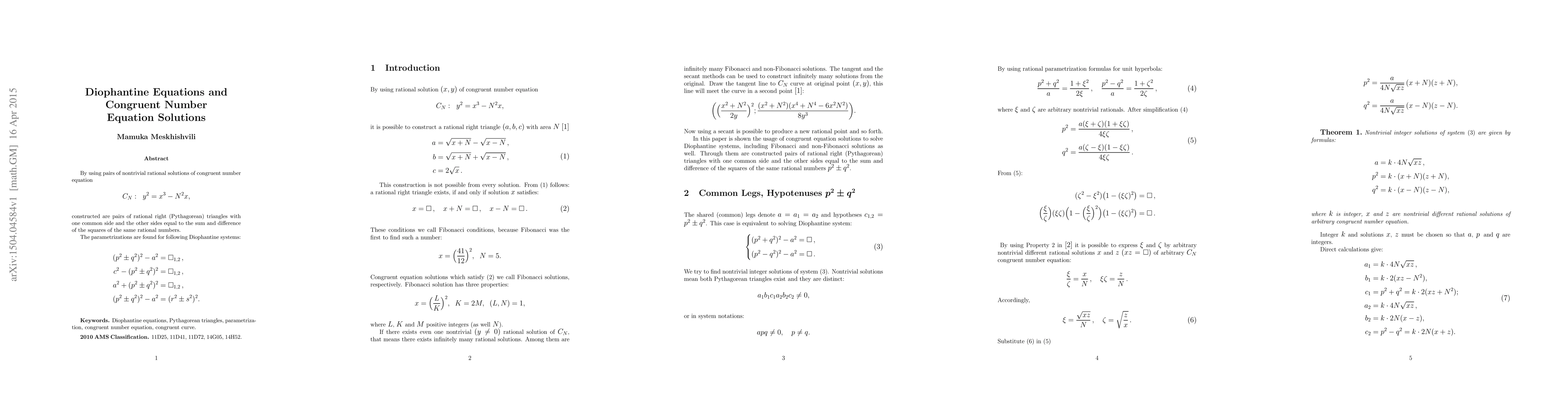 By using pairs of nontrivial rational solutions of congruent number equation $$ C_N:\;\;y^2=x^3-N^2x, $$ constructed are pairs of rational right (Pythagorean) triangles with one common side and the other sides equal to the sum and difference of the squares of the same rational numbers. The parametrizations are found for following Diophantine systems: \begin{align*} (p^2\pm q^2)^2-a^2 & =\square_{1,2}\,, \\[0.2cm] c^2-(p^2\pm q^2)^2 & =\square_{1,2}\,, \\[0.2cm] a^2+(p^2\pm q^2)^2 & =\square_{1,2}\,, \\[0.2cm] (p^2\pm q^2)^2-a^2 & =(r^2\pm s^2)^2. \end{align*}