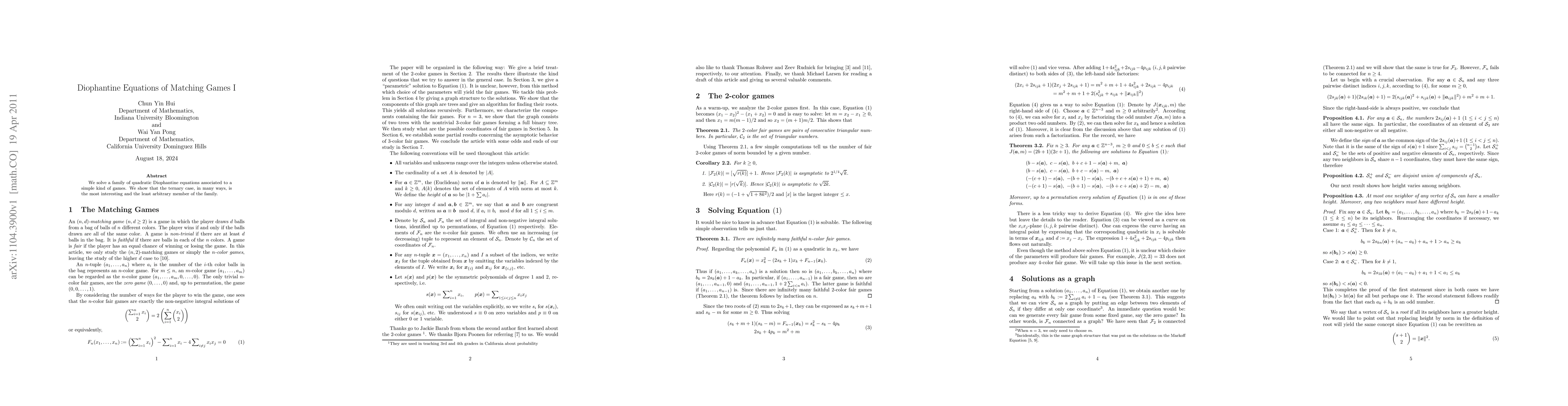 We solve a family of quadratic Diophantine equations associated to a simple kind of games. We show that the ternary case, in many ways, is the most interesting and the least arbitrary member of the family.