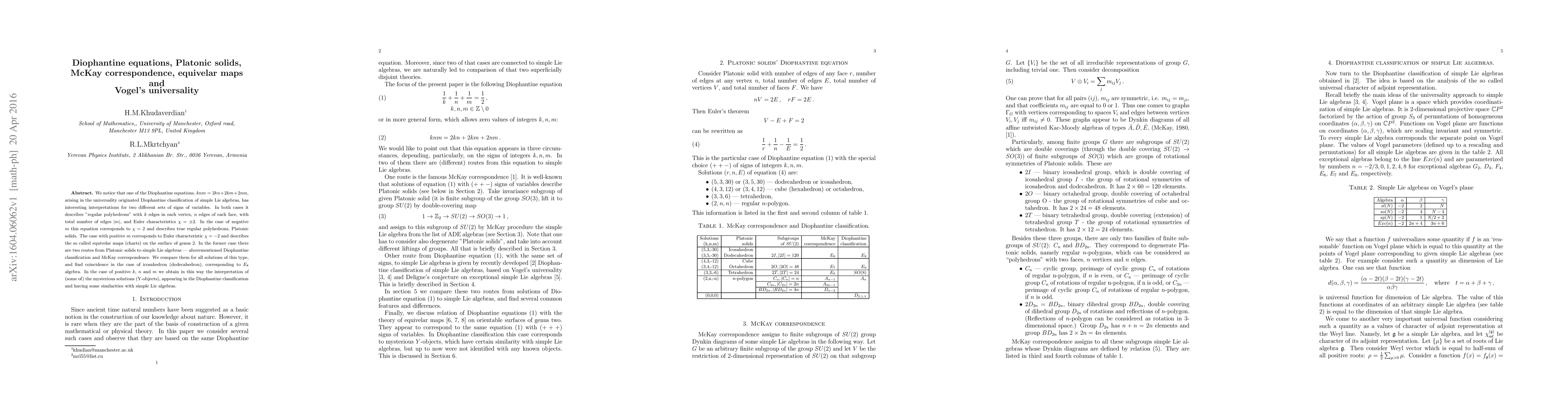 We notice that one of the Diophantine equations, $knm=2kn+2km+2nm$, arising in the universality originated Diophantine classification of simple Lie algebras, has interesting interpretations for two different sets of signs of variables. In both cases it describes "regular polyhedrons" with $k$ edges in each vertex, $n$ edges of each face, with total number of edges $|m|$, and Euler characteristics $\chi=\pm 2$. In the case of negative $m$ this equation corresponds to $\chi=2$ and describes true regular polyhedrons, Platonic solids. The case with positive $m$ corresponds to Euler characteristic $\chi=-2$ and describes the so called equivelar maps (charts) on the surface of genus $2$. In the former case there are two routes from Platonic solids to simple Lie algebras - abovementioned Diophantine classification and McKay correspondence. We compare them for all solutions of this type, and find coincidence in the case of icosahedron (dodecahedron), corresponding to $E_8$ algebra. In the case of positive $k$, $n$ and $m$ we obtain in this way the interpretation of (some of) the mysterious solutions (Y-objects), appearing in the Diophantine classification and having some similarities with simple Lie algebras.