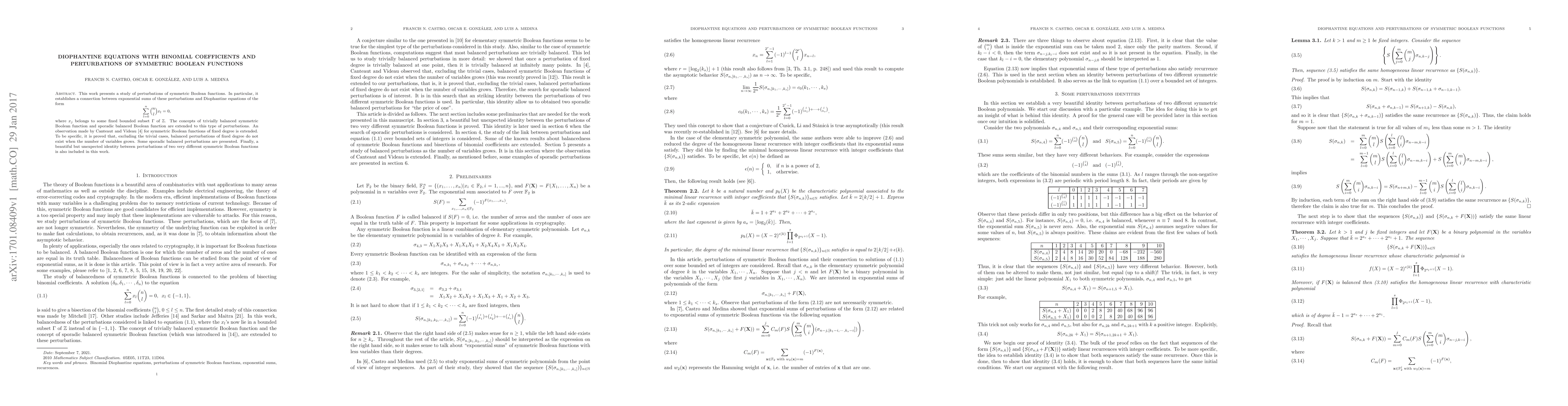 This work presents a study of perturbations of symmetric Boolean functions. In particular, it establishes a connection between exponential sums of these perturbations and Diophantine equations of the form $$ \sum_{l=0}^n \binom{n}{l} x_l=0,$$ where $x_j$ belongs to some fixed bounded subset $\Gamma$ of $\mathbb{Z}$. The concepts of trivially balanced symmetric Boolean function and sporadic balanced Boolean function are extended to this type of perturbations. An observation made by Canteaut and Videau for symmetric Boolean functions of fixed degree is extended. To be specific, it is proved that, excluding the trivial cases, balanced perturbations of fixed degree do not exist when the number of variables grows. Some sporadic balanced perturbations are presented. Finally, a beautiful but unexpected identity between perturbations of two very different symmetric Boolean functions is also included in this work.