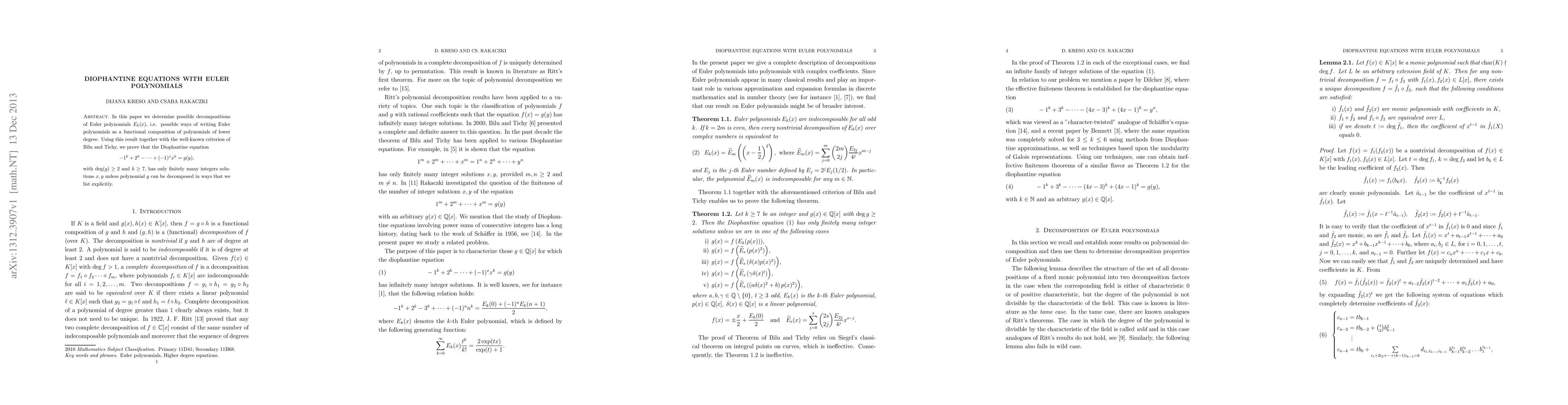 In this paper we determine possible decompositions of Euler polynomials $E_k(x)$, i.e. possible ways of writing Euler polynomials as a functional composition of polynomials of lower degree. Using this result together with the well-known criterion of Bilu and Tichy, we prove that the Diophantine equation $$-1^k +2 ^k - \cdots + (-1)^{x} x^k=g(y),$$ with $g\in \mathbb{Q}[X]$ of degree at least $2$ and $k\geq 7$, has only finitely many integers solutions $x, y$ unless polynomial $g$ can be decomposed in ways that we list explicitly.
