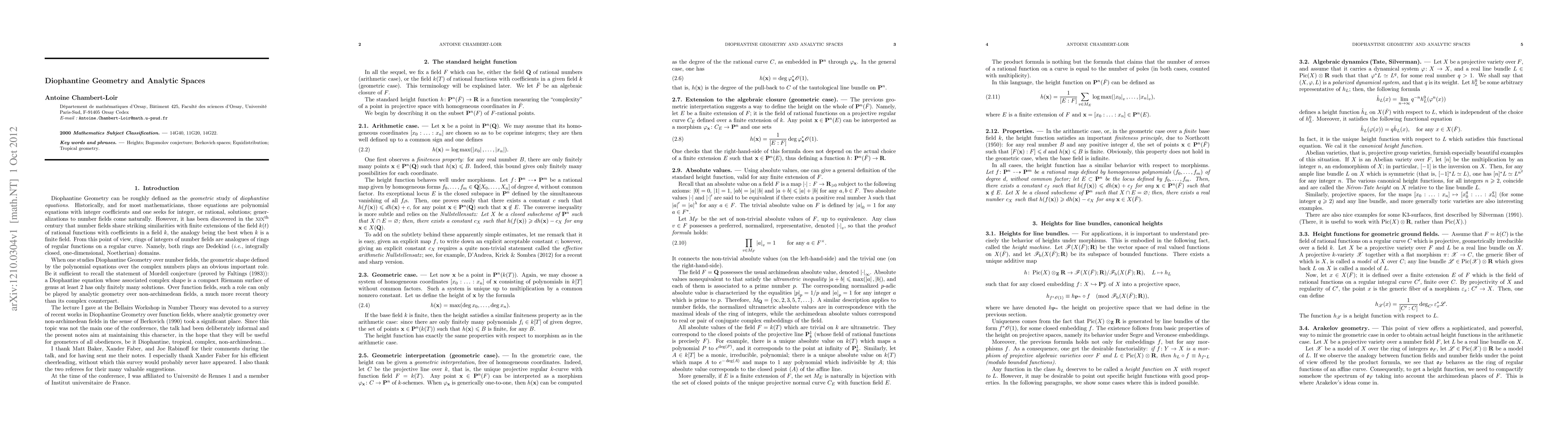 This paper summarizes a talk on Diophantine Geometry and Analytic Spaces, focusing on recent work by Gubler and Yamaki using Berkovich's analytic geometry. It introduces fundamental concepts in Diophantine Geometry, including heights and notable conjectures like Manin-Mumford and Bogomolov, with a mention of Ullmo and Zhang's proof.