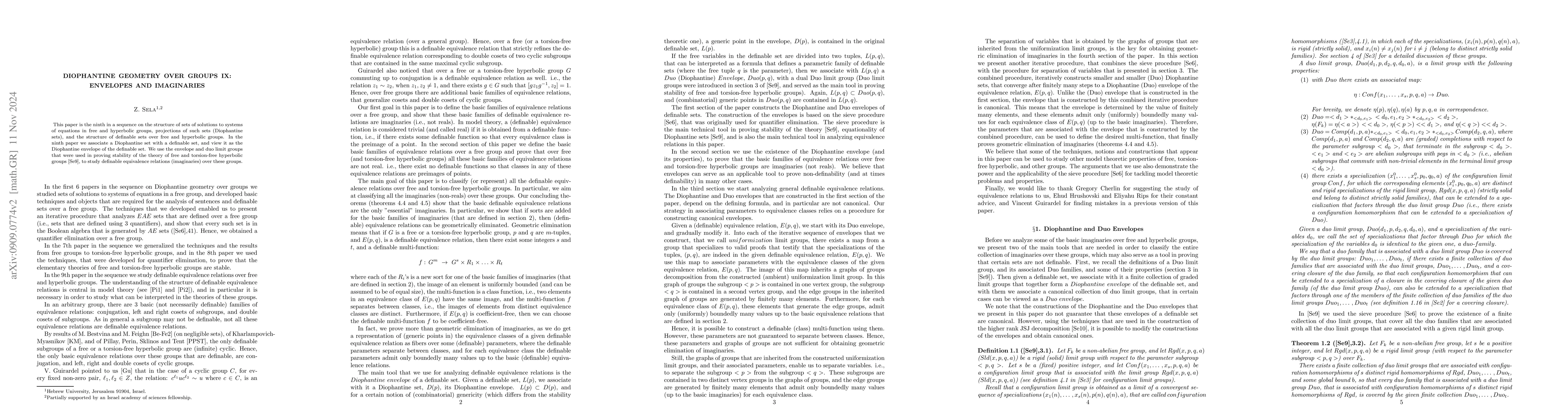 This paper is the ninth in a sequence on the structure of sets of solutions to systems of equations in free and hyperbolic groups, projections of such sets (Diophantine sets), and the structure of definable sets over free and hyperbolic groups. In the ninth paper we associate a Diophantine set with a definable set, and view it as the Diophantine envelope of the definable set. We use the envelope and duo limit groups that were used in proving stability of the theory of free and torsion-free hyperbolic groups [Se9], to study definable equivalence relations, and in particular, to classify imaginaries over these groups.