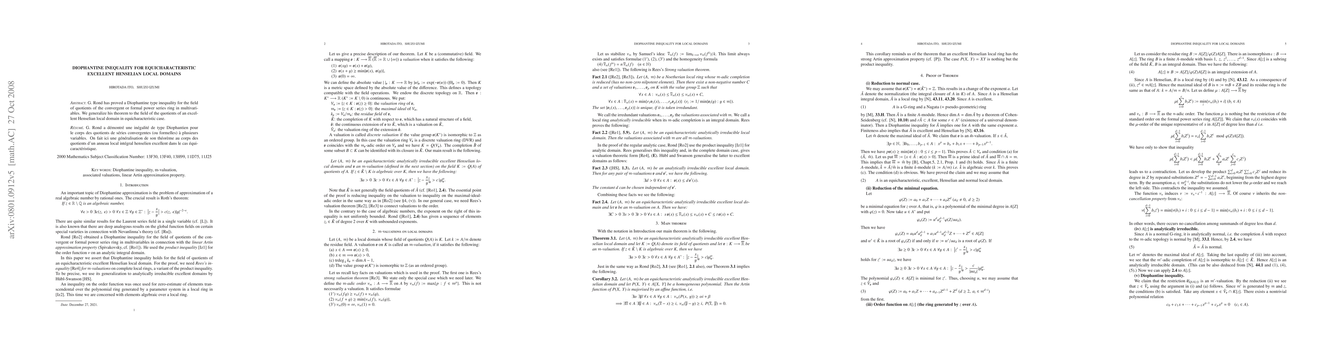 Researchers generalize a Diophantine inequality to equicharacteristic Henselian local domains, extending a previous result in fields of quotients of convergent power series rings. The new theorem has implications for number theory and algebraic geometry in excellent Henselian settings.