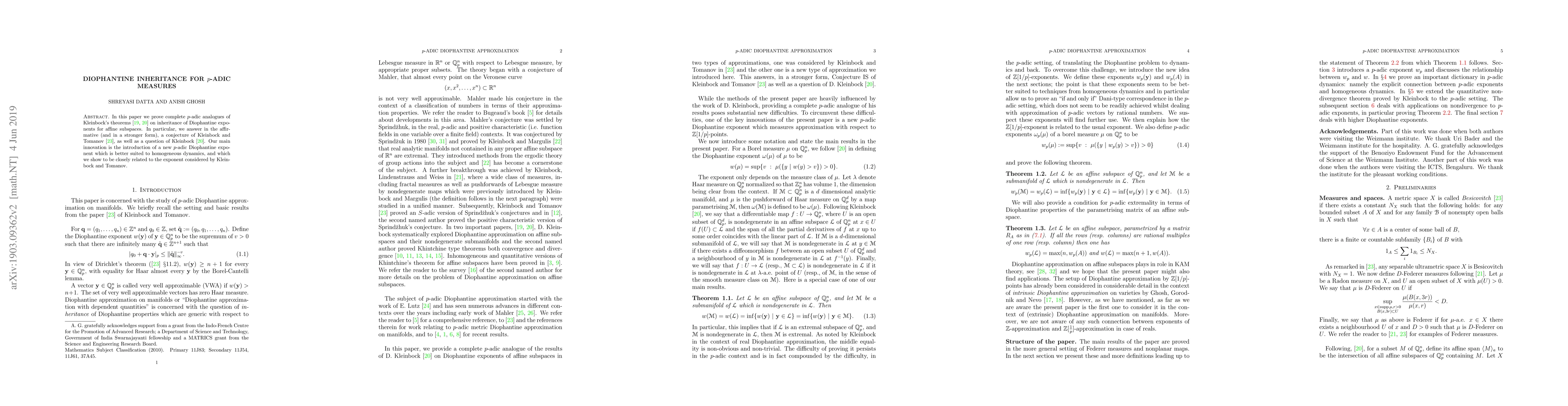 This paper establishes complete $p$-adic analogues of Kleinbock's theorems on Diophantine inheritance for affine subspaces, introducing a new $p$-adic Diophantine exponent that better suits homogeneous dynamics. It affirms and strengthens a conjecture by Kleinbock and Tomanov, and resolves a question posed by Kleinbock.