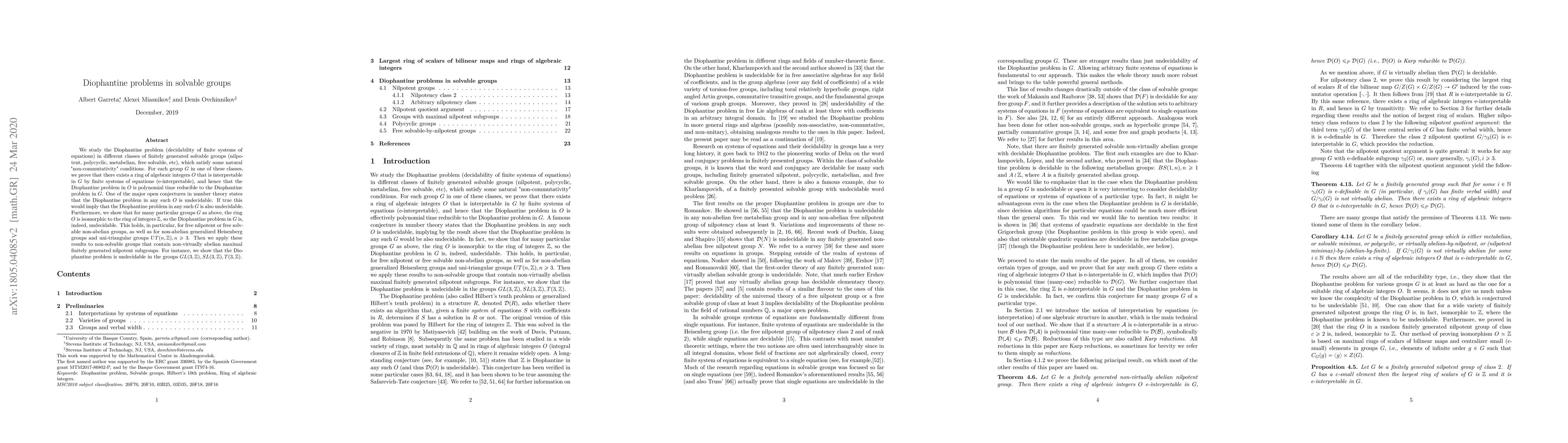 We study the Diophantine problem (decidability of finite systems of equations) in different classes of finitely generated solvable groups (nilpotent, polycyclic, metabelian, free solvable, etc), which satisfy some natural "non-commutativity" conditions. For each group $G$ in one of these classes, we prove that there exists a ring of algebraic integers $O$ that is interpretable in $G$ by finite systems of equations (e-interpretable), and hence that the Diophantine problem in $O$ is polynomial time reducible to the Diophantine problem in $G$. One of the major open conjectures in number theory states that the Diophantine problem in any such $O$ is undecidable. If true this would imply that the Diophantine problem in any such $G$ is also undecidable. Furthermore, we show that for many particular groups $G$ as above, the ring $O$ is isomorphic to the ring of integers $\mathbb{Z}$, so the Diophantine problem in $G$ is, indeed, undecidable. This holds, in particular, for free nilpotent or free solvable non-abelian groups, as well as for non-abelian generalized Heisenberg groups and uni-triangular groups $UT(n,\mathbb{Z}), n \geq 3$. Then we apply these results to non-solvable groups that contain non-virtually abelian maximal finitely generated nilpotent subgroups. For instance, we show that the Diophantine problem is undecidable in the groups $GL(3,\mathbb{Z}), SL(3,\mathbb{Z}), T(3,\mathbb{Z})$.