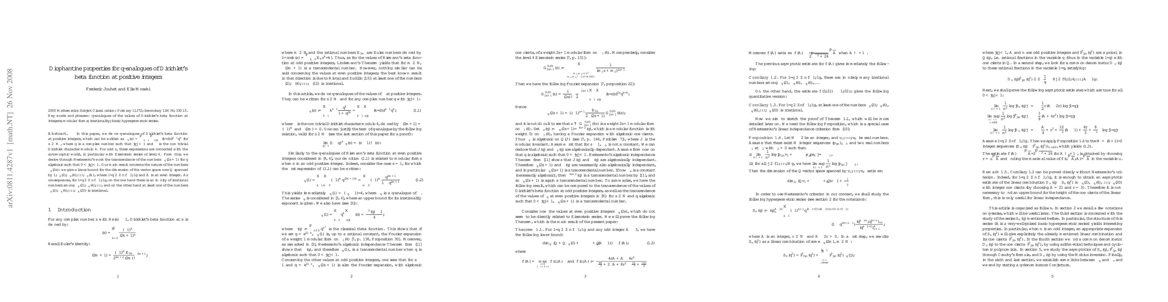 small In this paper, we define $q$-analogues of Dirichlet's beta function at positive integers, which can be written as $\beta_q(s)=\sum_{k\geq1}\sum_{d|k}\chi(k/d)d^{s-1}q^k$ for $s\in\N^*$, where $q$ is a complex number such that $|q|<1$ and $\chi$ is the non trivial Dirichlet character modulo 4. For odd $s$, these expressions are connected with the automorphic world, in particular with Eisenstein series of level 4. From this, we derive through Nesterenko's work the transcendance of the numbers $\beta_q(2s+1)$ for $q$ algebraic such that $0<|q|<1$. Our main result concerns the nature of the numbers $\beta_q(2s)$: we give a lower bound for the dimension of the vector space over $\Q$ spanned by $1,\beta_q(2),\beta_q(4),...,\beta_q(A)$, where $1/q\in\Z\setminus\{-1;1\}$ and $A$ is an even integer. As consequences, for $1/q\in\Z\setminus\{-1;1\}$, on the one hand there is an infinity of irrational numbers among $\beta_q(2),\beta_q(4),...$, and on the other hand at least one of the numbers $\beta_q(2),\beta_q(4),..., \beta_q(20)$ is irrational.