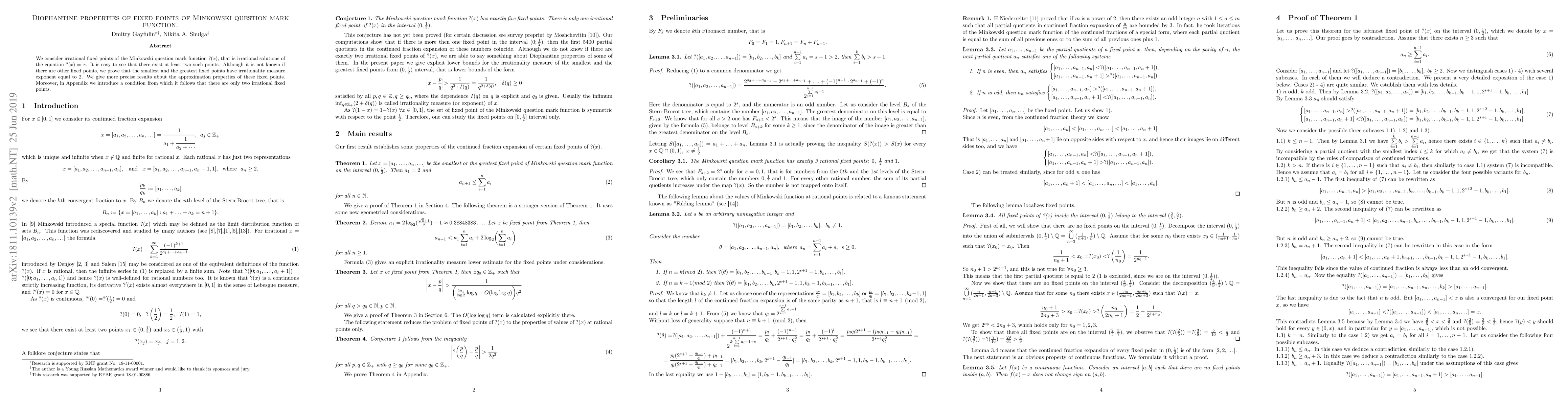 We consider irrational fixed points of the Minkowski question mark function $? (x)$, that is irrational solutions of the equation $? (x)=x$. It is easy to see that there exist at least two such points. Although it is not known if there are other fixed points, we prove that the smallest and the greatest fixed points have irrationality measure exponent equal to 2. We give more precise results about the approximation properties of these fixed points. Moreover, in Appendix we introduce a condition from which it follows that there are only two irrational fixed points.