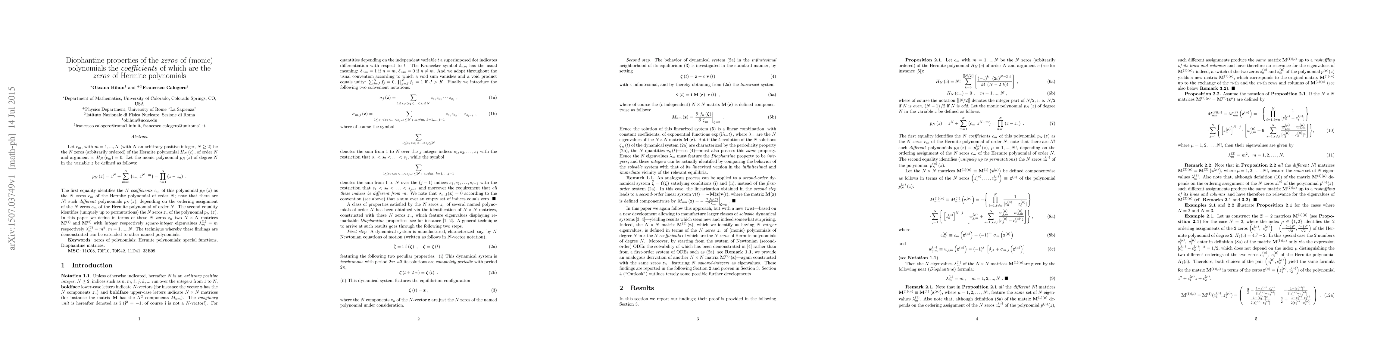 We introduce a monic polynomial p_N(z) of degree N whose coefficients are the zeros of the N-th degree Hermite polynomial. Note that there are N! such different polynomials p_N(z), depending on the ordering assignment of the N zeros of the Hermite polynomial of order N. We construct two NxN matrices M_1 and M_2 defined in terms of the N zeros of the polynomial p_N(z). We prove that the eigenvalues of M_1 and M_2 are the first N integers respectively the first N squared-integers, a remarkable isospectral and Diophantine property. The technique whereby these findings are demonstrated can be extended to other named polynomials.
