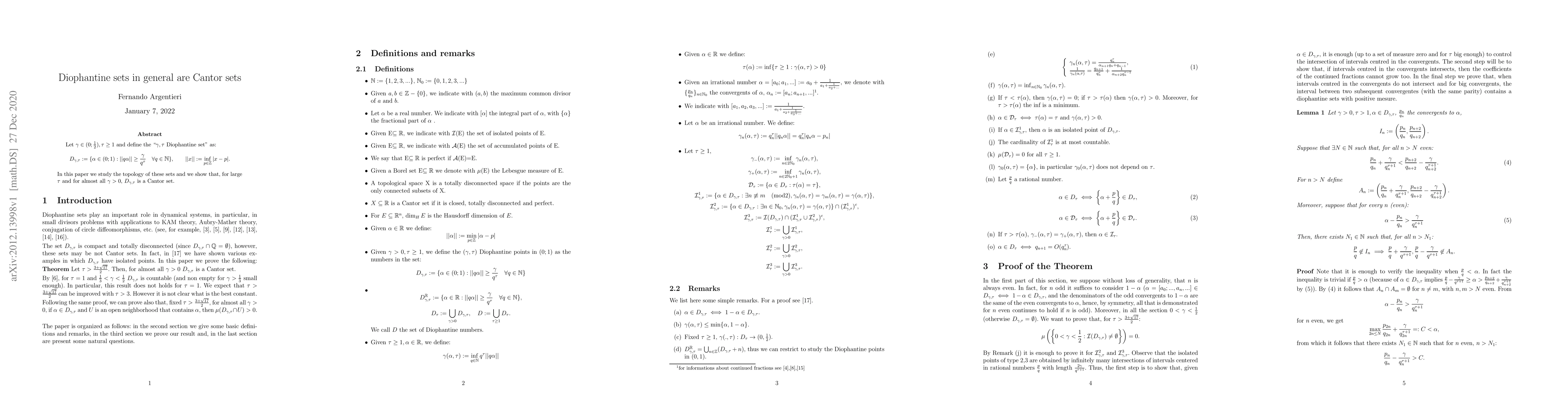 Let $\gamma\in(0;\frac{1}{2}),\tau\geq 1$ and define the "$\gamma,\tau$ Diophantine set" as: $$D_{\gamma,\tau}:=\{\alpha\in (0;1): ||q\alpha||\geq\frac{\gamma}{q^{\tau}}\quad\forall q\in\Bbb{N}\},\qquad||x||:=\inf_{p\in\Bbb{Z}}|x-p|. $$ In this paper we study the topology of these sets and we show that, for large $\tau$ and for almost all $\gamma>0$, $D_{\gamma,\tau}$ is a Cantor set.