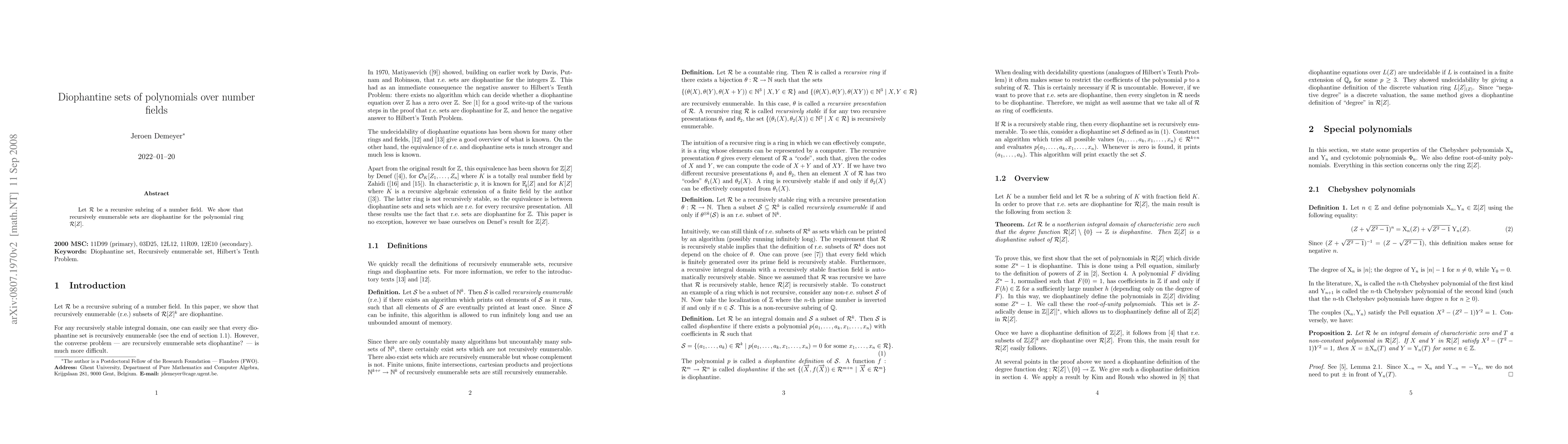 Summary: The paper demonstrates that recursively enumerable sets are Diophantine for polynomial rings over recursive subrings of number fields, establishing a connection between computability and Diophantine properties in algebraic number theory.
