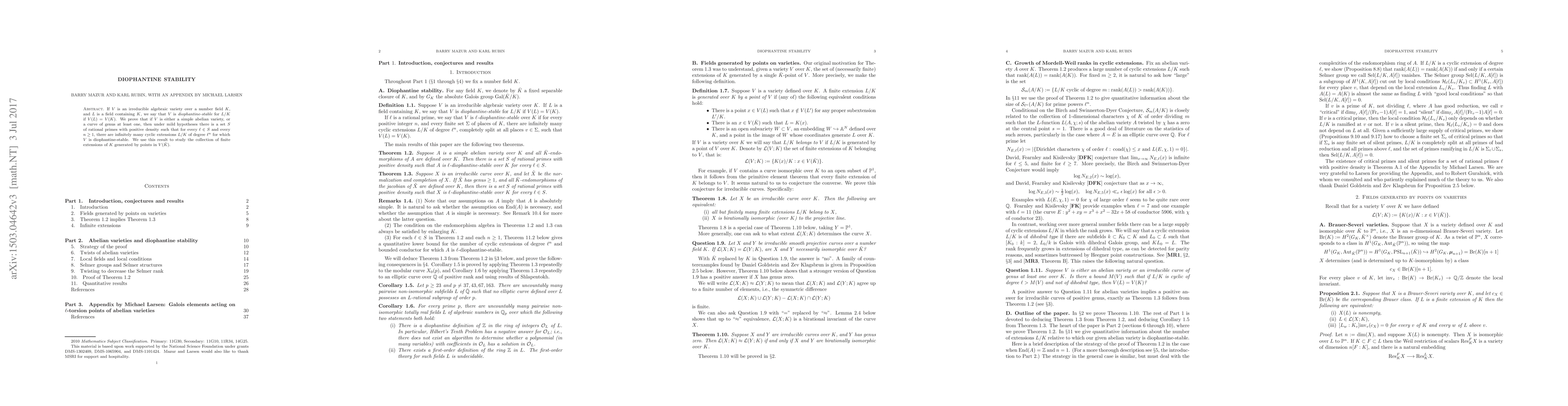 If $V$ is an irreducible algebraic variety over a number field $K$, and $L$ is a field containing $K$, we say that $V$ is diophantine-stable for $L/K$ if $V(L) = V(K)$. We prove that if $V$ is either a simple abelian variety, or a curve of genus at least one, then under mild hypotheses there is a set $S$ of rational primes with positive density such that for every $\ell \in S$ and every $n \ge 1$, there are infinitely many cyclic extensions $L/K$ of degree $\ell^n$ for which $V$ is diophantine-stable. We use this result to study the collection of finite extensions of $K$ generated by points in $V(\bar{K})$.
