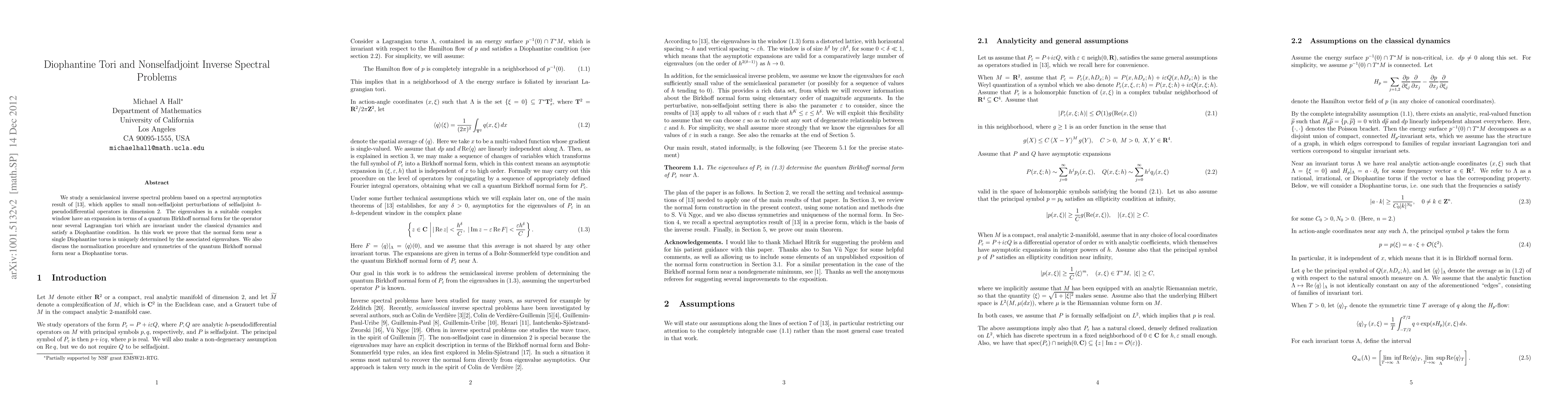 This paper investigates a semiclassical inverse spectral problem for non-selfadjoint perturbations of selfadjoint $h$-pseudodifferential operators in dimension 2, focusing on the eigenvalues near Diophantine tori. The authors prove that the quantum Birkhoff normal form near a single Diophantine torus is uniquely determined by the associated eigenvalues and discuss the normalization procedure and symmetries of this form.