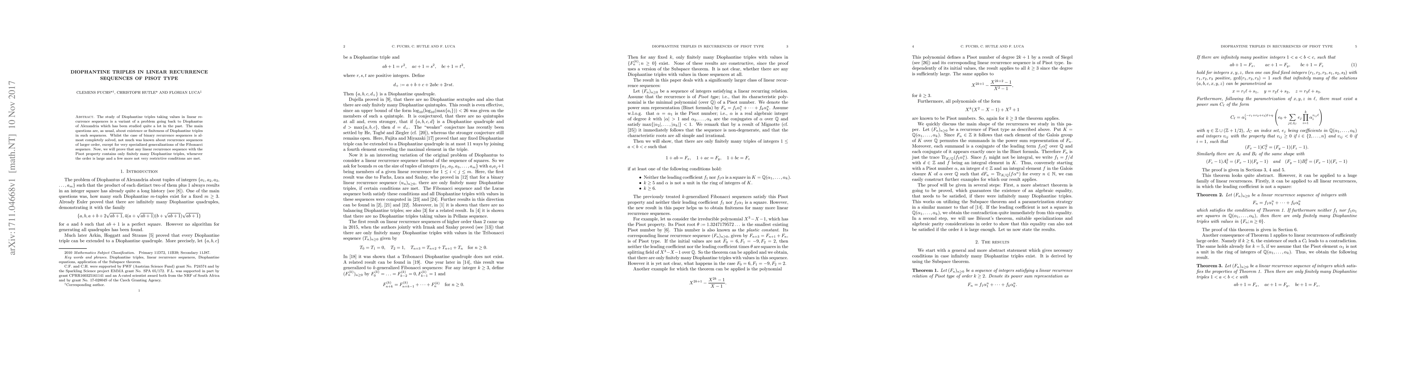 This paper proves that linear recurrence sequences of Pisot type, provided they have a sufficiently large order and meet certain conditions, contain only a finite number of Diophantine triples. This resolves a longstanding question regarding the existence or finiteness of such triples in higher-order recurrence sequences.