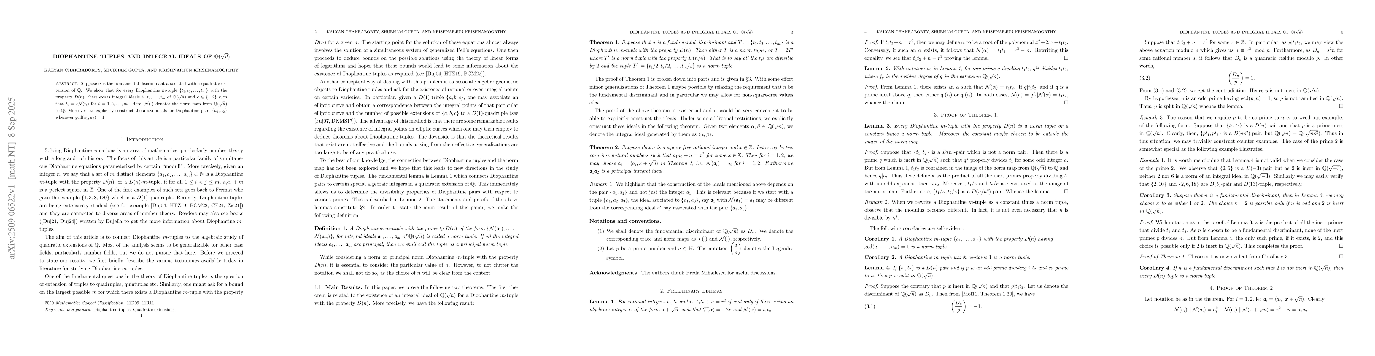 Suppose $n$ is the fundamental discriminant associated with a quadratic extension of $\mathbb{Q}$. We show that for every Diophantine $m$-tuple $ \{t_1, t_2, \ldots, t_m\} $ with the property $ D(n) $, there exists integral ideals $ \mathfrak{t}_1, \mathfrak{t}_2, \ldots, \mathfrak{t}_m $ of $ \mathbb{Q}(\sqrt{n}) $ and $c\in \{1,2\}$ such that $ t_i= c\mathcal{N}(\mathfrak{t}_i) $ for $ i=1,2, \ldots, m $. Here, $ \mathcal{N}(\cdot) $ denotes the norm map from $\mathbb{Q}(\sqrt{n})$ to $\mathbb{Q}$. Moreover, we explicitly construct the above ideals for Diophantine pairs $\{a_1, a_2\}$ whenever $\gcd(a_1, a_2) = 1$.