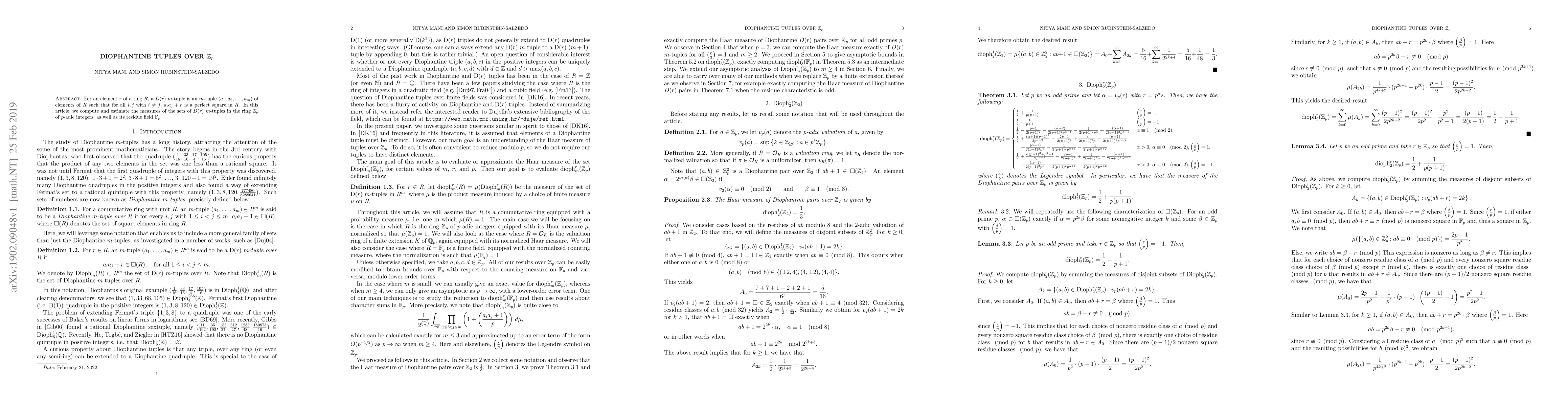For an element $r$ of a ring $R$, a Diophantine $D(r)$ $m$-tuple is an $m$-tuple $(a_1,a_2,\ldots,a_m)$ of elements of $R$ such that for all $i,j$ with $i\neq j$, $a_ia_j+r$ is a perfect square in $R$. In this article, we compute and estimate the measures of the sets of $D(r)$ $m$-tuples in the ring $\mathbb{Z}_p$ of $p$-adic integers, as well as its residue field $\mathbb{F}_p$.