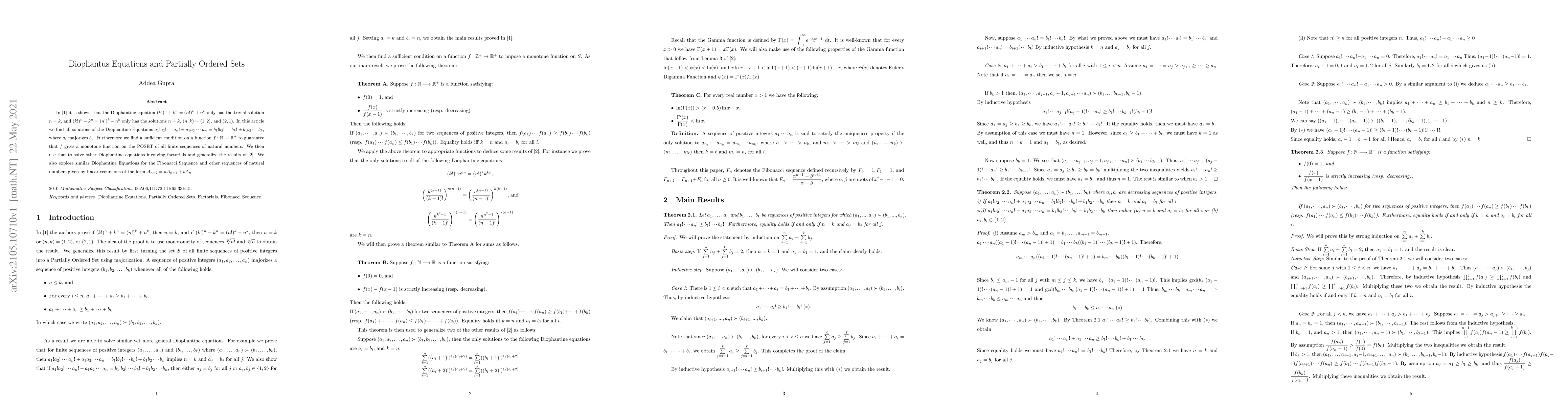 In [1] it is shown that the Diophantine equation $(k!)^n+k^n=(n!)^k+n^k$ only has the trivial solution $n=k$, and $(k!)^n-k^n=(n!)^k-n^k$ only has the solutions $n=k$, $(n, k)=(1, 2),$ and $(2, 1)$. In this article we find all solutions of the Diophantine Equations $a_1!a_2!\cdots a_n! \pm a_1a_2 \cdots a_n = b_1!b_2! \cdots b_k! \pm b_1b_2 \cdots b_k$, where $a_i$ majorizes $b_i$. Furthermore we find a sufficient condition on a function $f:N\to R^+$ to guarantee that $f$ gives a monotone function on the POSET of all finite sequences of natural numbers. We then use that to solve other Diophantine equations involving factorials and generalize the results of [2]. We also explore similar Diophantine Equations for the Fibonacci Sequence and other sequences of natural numbers given by linear recursions of the form $A_{n+2}=aA_{n+1}+bA_{n}$.