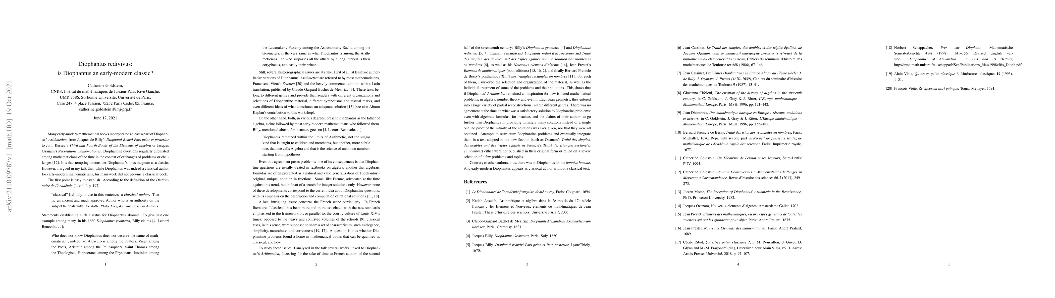 Many early-modern mathematical books incorporated at least a part of Diophantus' Arithmetica, from Jacques de Billy's Diophanti Redivi Pars prior et posterior to John Kersey's Third and Fourth Books of the Elements of algebra or Jacques Ozanam's Recr{\'e}ations math{\'e}matiques. Diophantine questions regularly circulated among mathematicians of the time in the context of exchanges of problems or challenges. It is thus tempting to consider Diophantus's opus magnum as a classic. However, I argued in my talk that, while Diophantus was indeed a classical author for early-modern mathematicians, his main work did not become a classical book.
