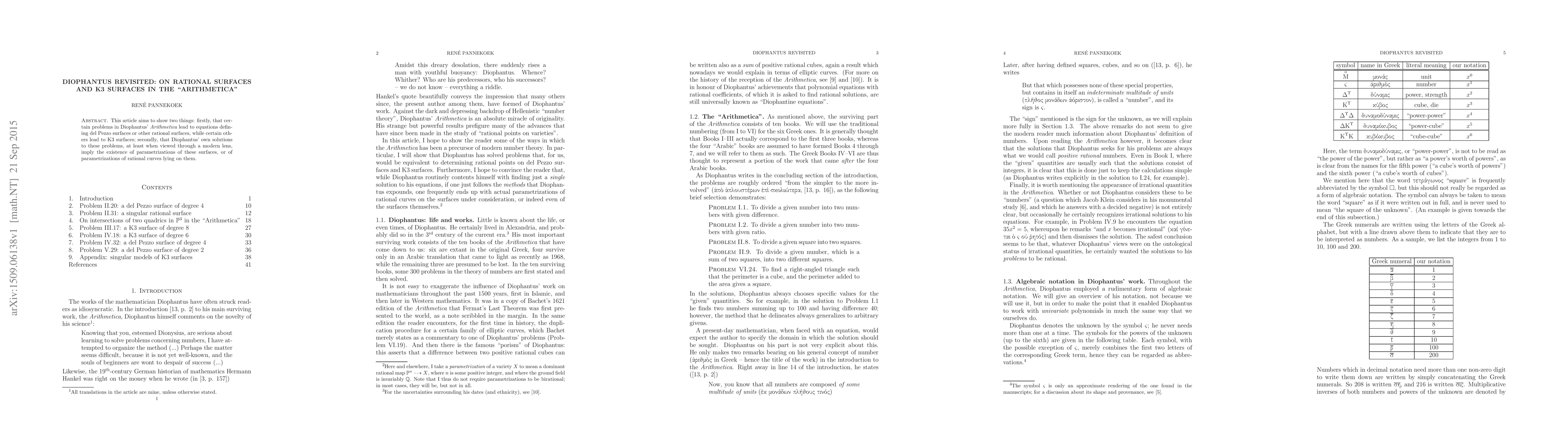This article demonstrates that Diophantus' Arithmetica contains problems defining del Pezzo or rational surfaces and K3 surfaces, and shows that his solutions parametrize these surfaces or rational curves on them when analyzed with contemporary mathematical techniques.