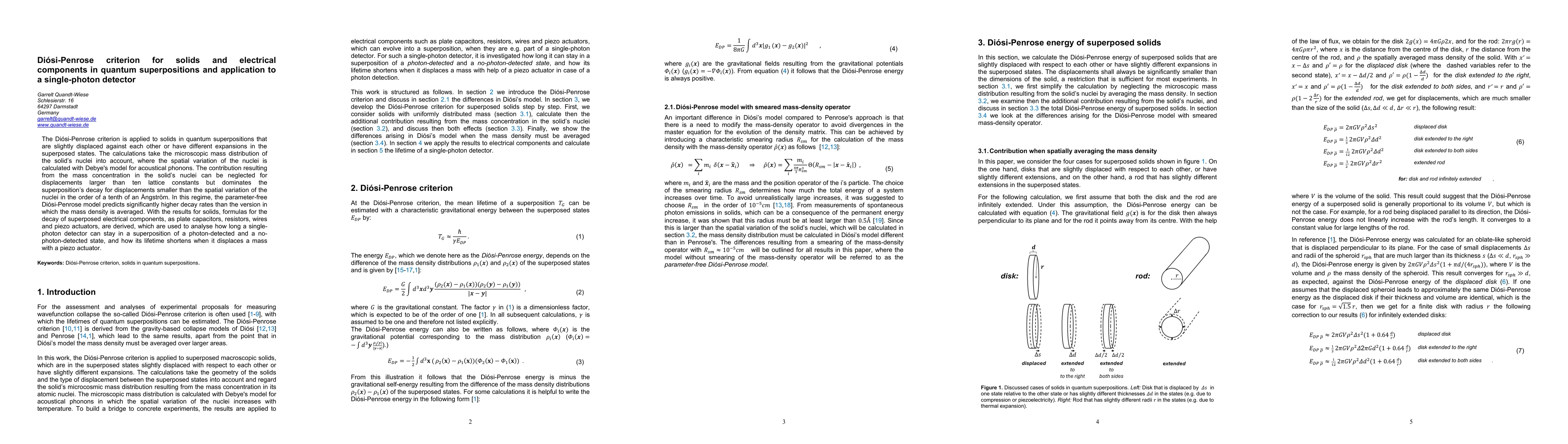 A formulary for the application of the Diosi-Penrose criterion to solids in quantum superpositions is developed, which takes the solid's microscopic mass distribution (resulting from its nuclei) and its macroscopic shape into account, where the solid's states can differ by slightly different positions or extensions of the solid. For small displacements, smaller than the spatial variation of the solid's nuclei, the characteristic energy of the Diosi-Penrose criterion is mainly determined by the mass distribution of the nuclei. For large displacements, much larger than the solid's lattice constant, the solid can be idealised as a continuum, and the characteristic energy depends on the solid's shape and the direction of the displacement. In Diosi's approach, in which the mass density operator has to be smeared, the solid's microscopic mass distribution plays no role. The results are applied to a special single-photon avalanche photodiode detector, which interacts as little as possible with its environment. This is realised by disconnecting the detector from the measurement devices when it is in a superposition, and by biasing the photodiode by a plate capacitor, which is charged shortly before the photon's arrival. For a suitable choice of components, the detector can stay in a superposition for seconds; its lifetime can be shortened to microseconds with the help of a piezoactuator, which displaces a mass in the case of photon detection.
