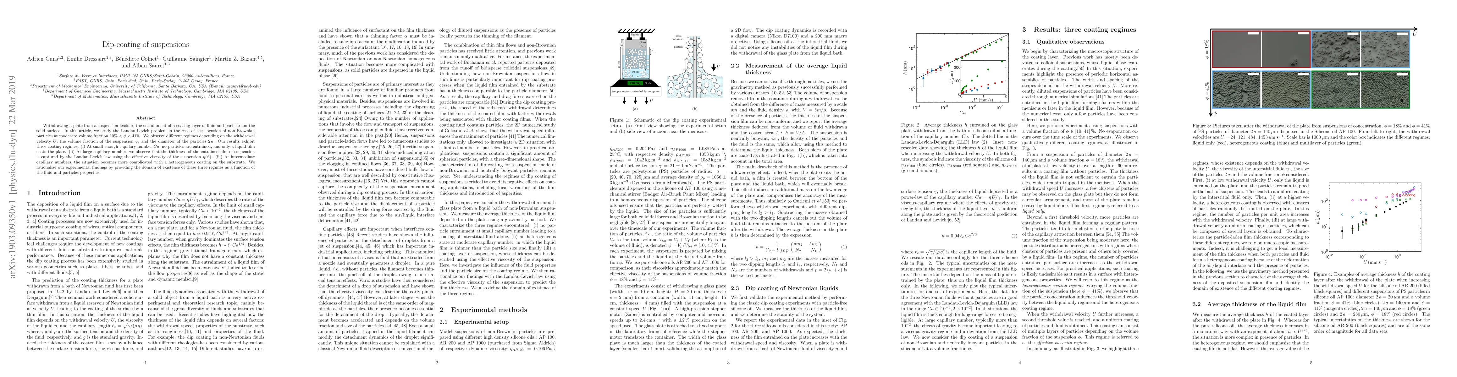 This research investigates the dip-coating of suspensions, revealing three distinct coating regimes based on withdrawal velocity, particle volume fraction, and particle diameter. At low capillary numbers, only a liquid film forms; at high numbers, film thickness adheres to the Landau-Levich law using effective viscosity; and at intermediate numbers, complex heterogeneous coatings emerge.